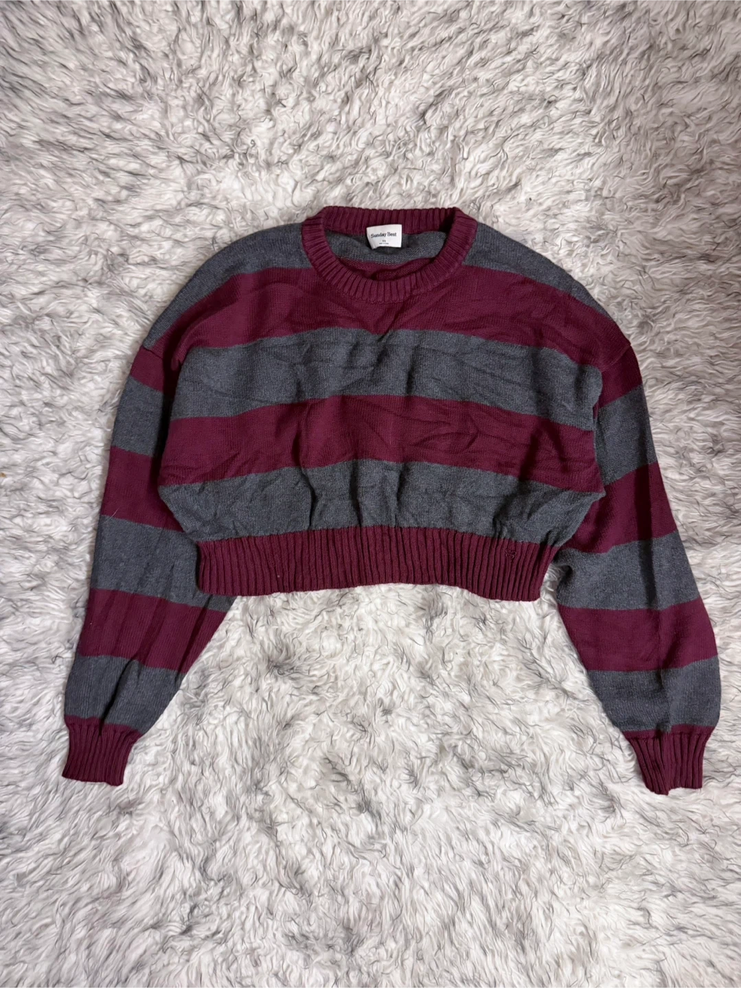 When cashmere met cotton. This is a cropped crewneck sweater with dropped shoulders and fully fashioned construction. It’s knit with soft, warm yarn that combines organic cotton with cozy cashmere. This version is constructed using our Crush Jersey stitch for a soft drape and a smooth, flat feel. It features a rugby stripe pattern that's been woven in, as opposed to printed on, for a more dimensional look. Content: 95% organic cotton, 5% cashmere.