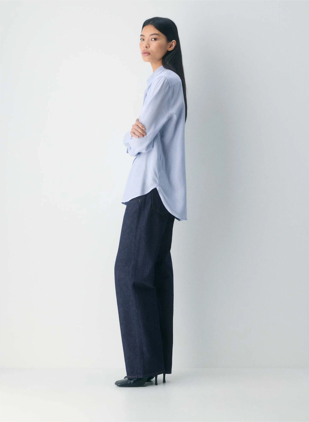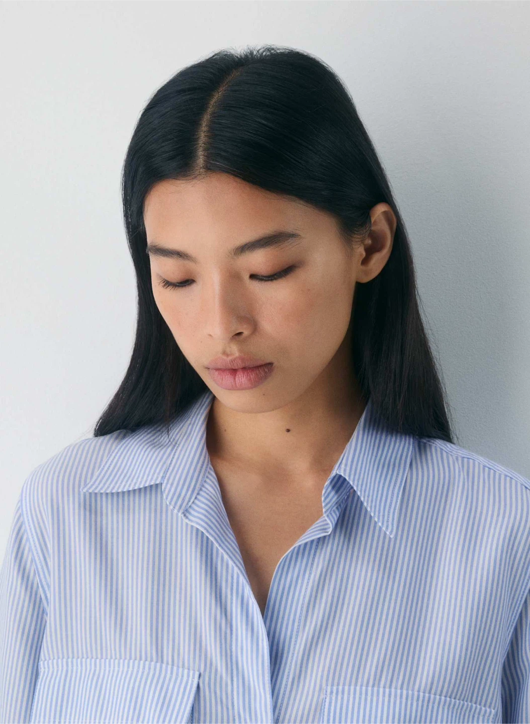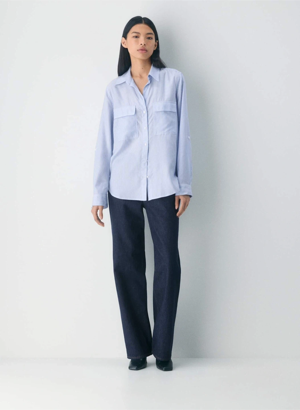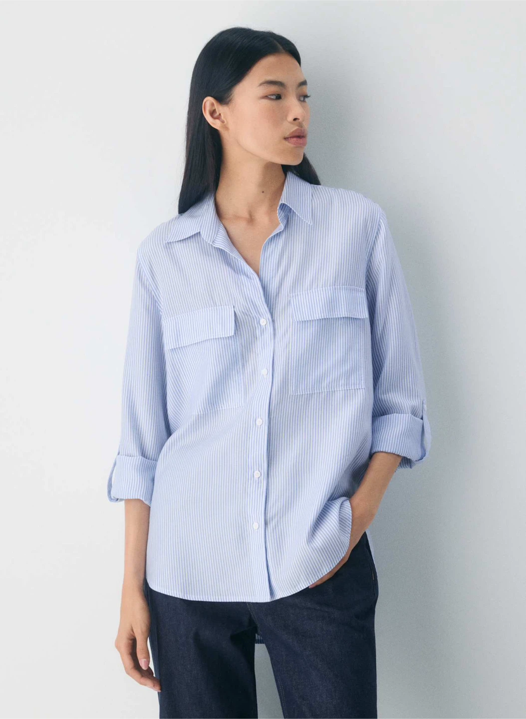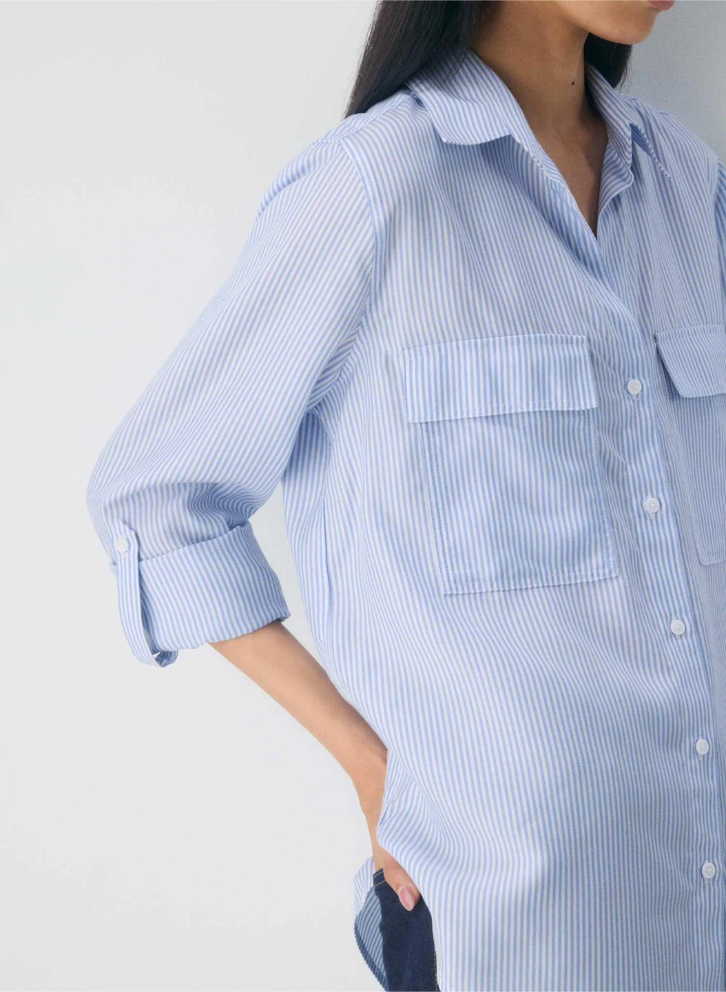 Change your sleeves with your mood. Up your sleeves. A versatile essential perfected season after season, this is a button-up utility blouse with adjustable sleeves and patch pockets.