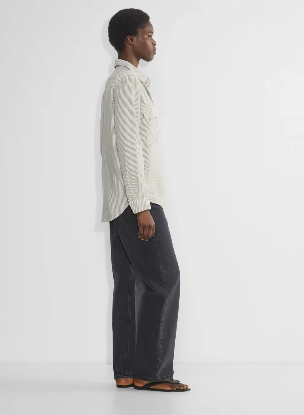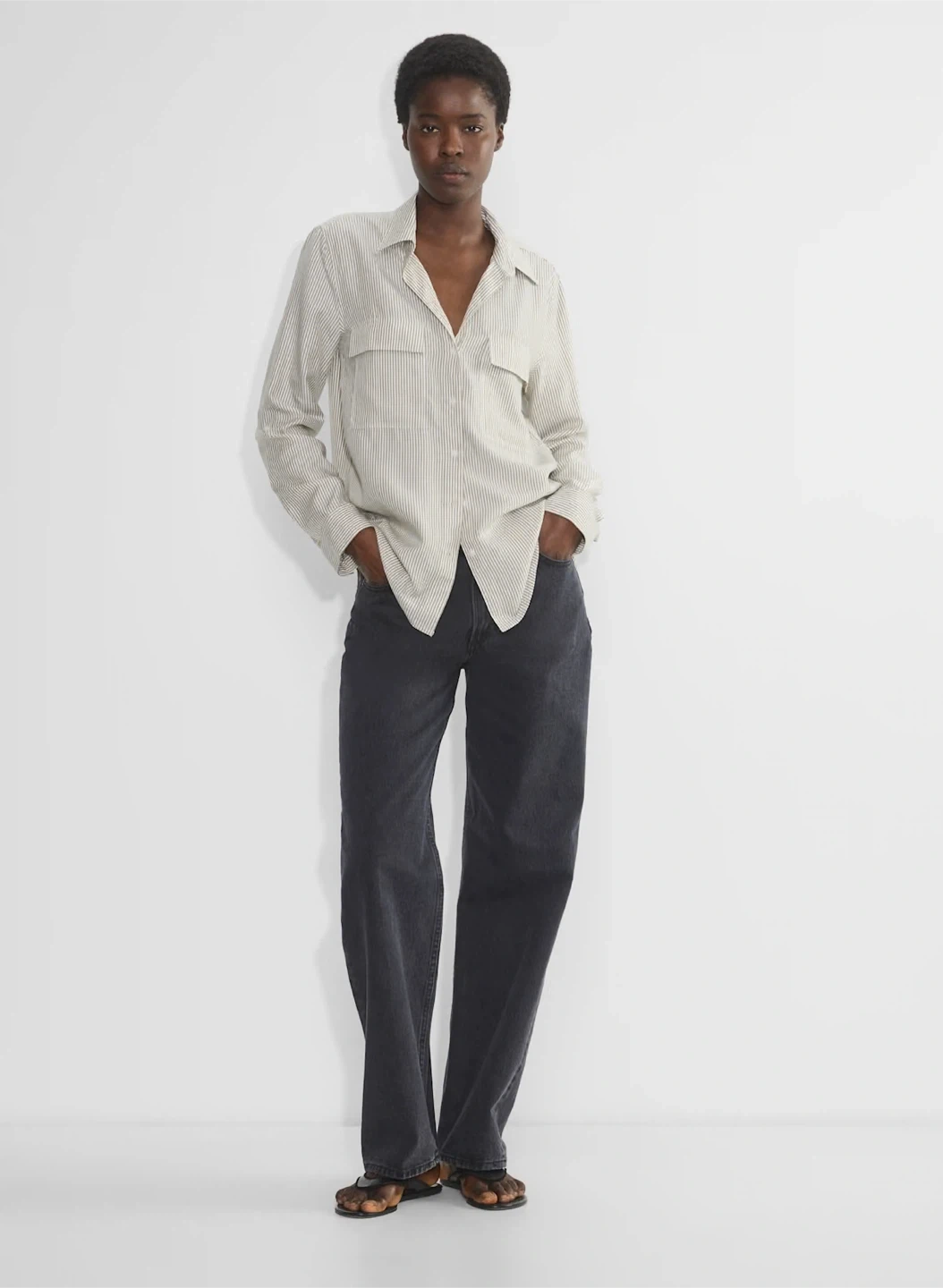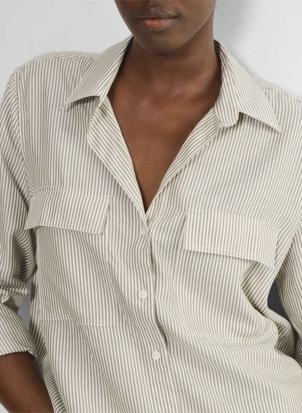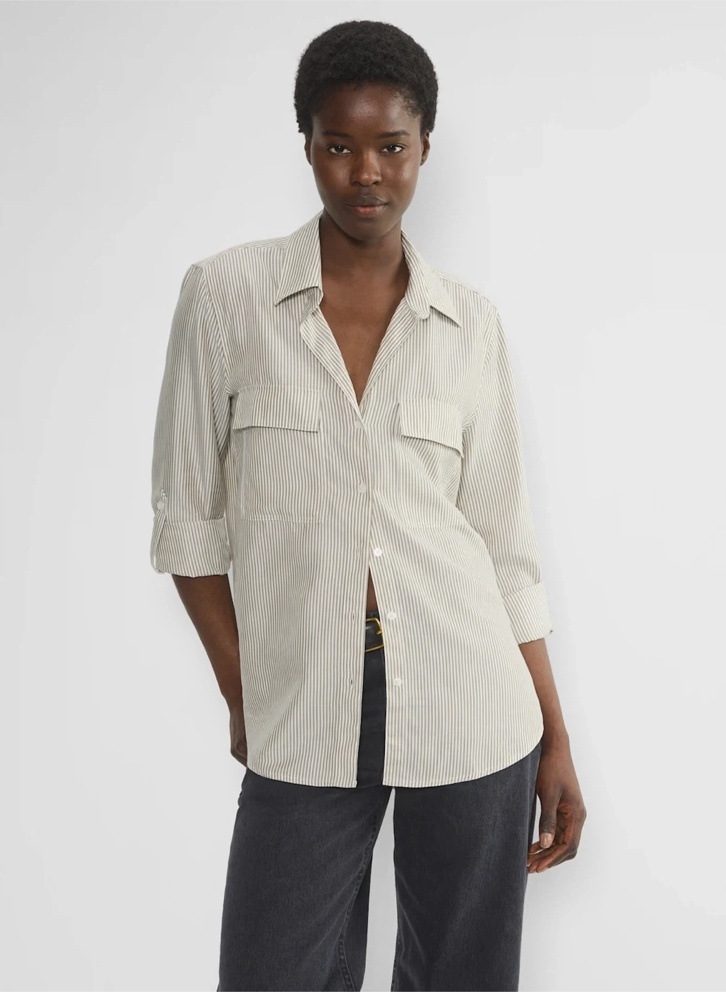 Change your sleeves with your mood. Up your sleeves. A versatile essential perfected season after season, this is a button-up utility blouse with adjustable sleeves and patch pockets.
