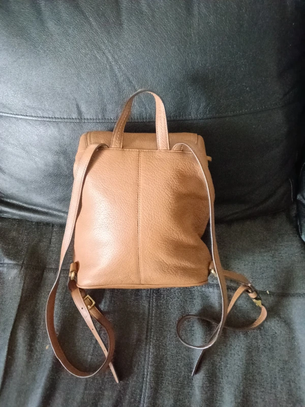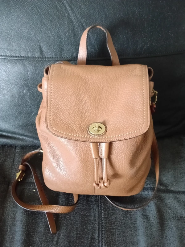 This is a stylish Coach leather backpack in a beautiful tan color! It's the perfect size for everyday use and has adjustable straps for a comfortable fit. The leather is in great condition and the bag has been well cared for. It's a great way to carry your belongings in style!