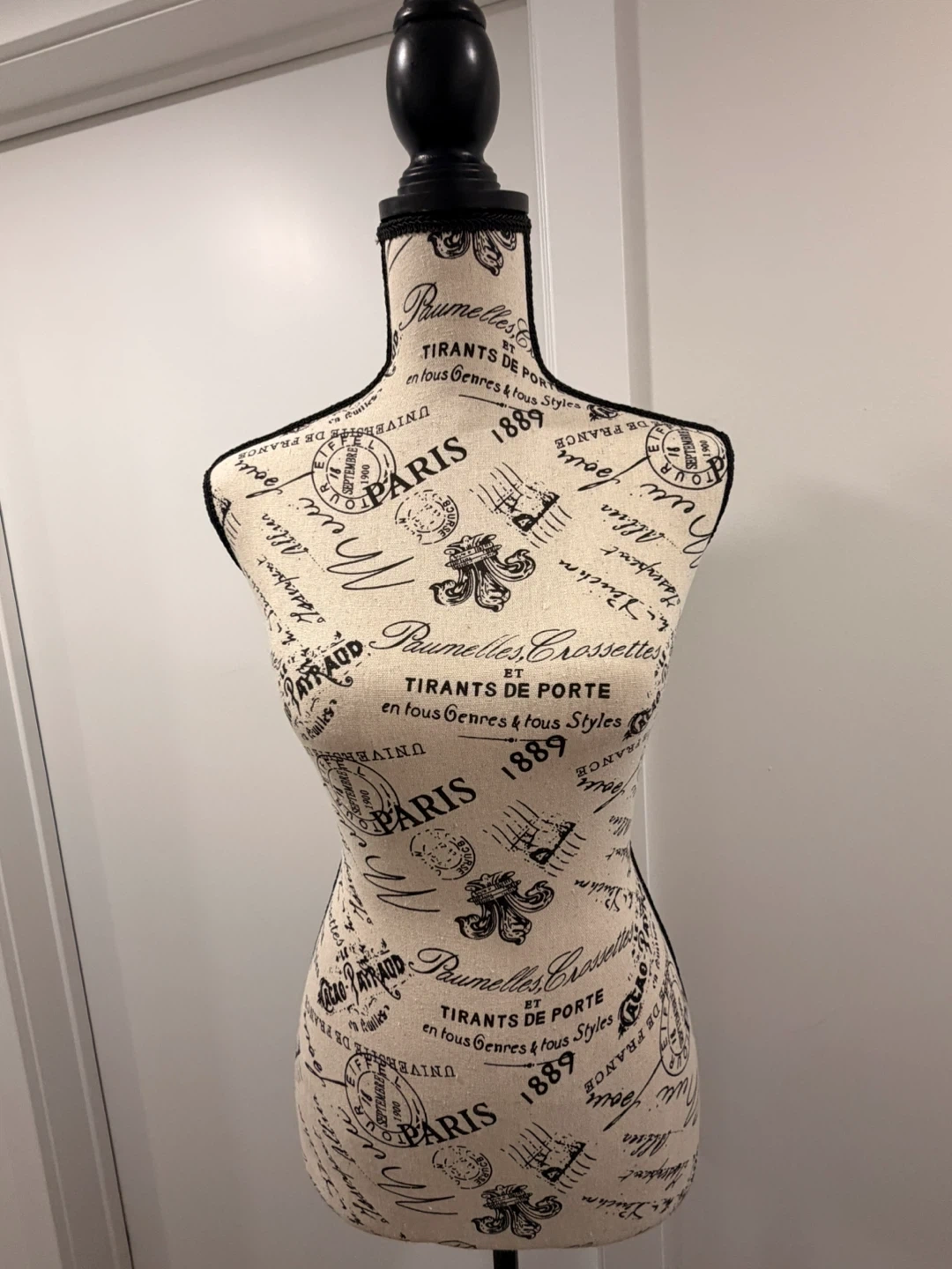 Selling a decorative mannequin with a Paris-themed print. It's in great condition and would make a lovely addition to any room!