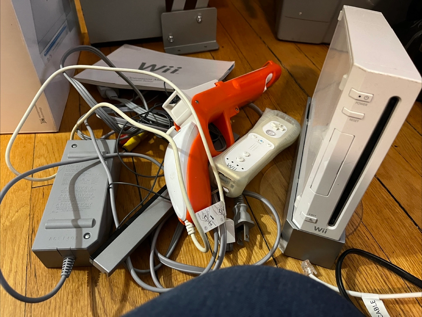 Selling a used Nintendo Wii console. Includes the console, 2 Wii remotes, 1 nunchuck, gun adaptor. sensor bar, power adapter, and AV cables.