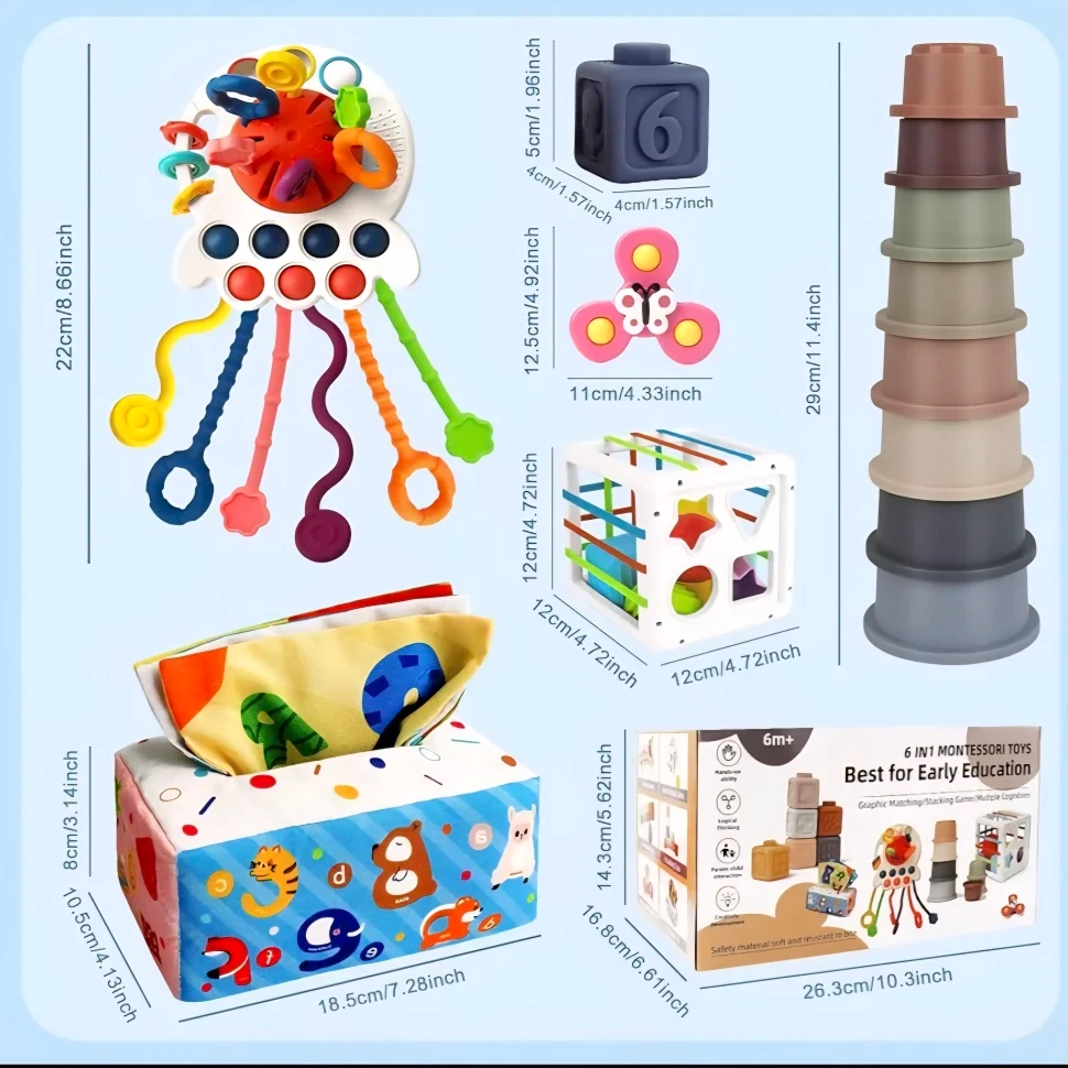 【What's in the box】1x sensory bin 6 shape Sorting toys, 1x baby tissue box, 8x stacking cups, 1x pull string toy, 6x stacking blocks and 1x suction cup spinner toy.
