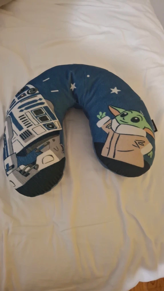 This is a Star Wars themed neck pillow. It features R2-D2 and Baby Yoda