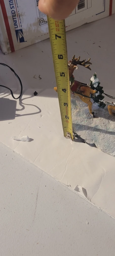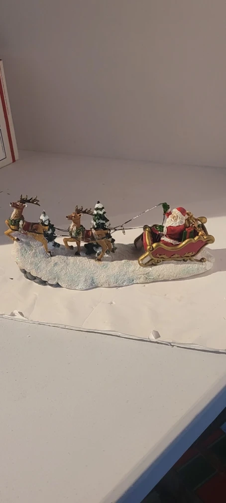 Here is a charming Santa Claus figurine featuring Santa in his sleigh, pulled by reindeer! The figurine is about 7 inches tall and 12 inches long. It would be a lovely addition to your holiday decor