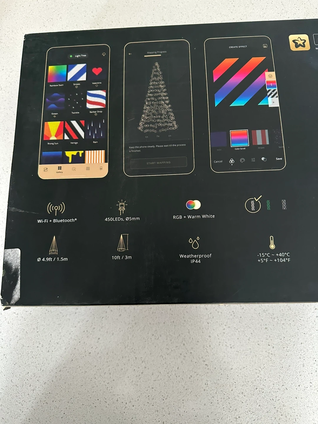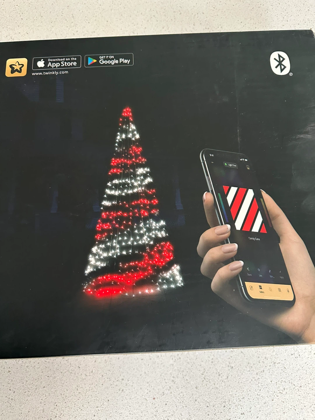 Get ready to light up the holidays with this Twinkly Light Tree! It's a Generation II, 450 Special Edition RGB + W LED tree that's app-controlled. It's 10ft/3m tall, and the box says it's weatherproof with an IP44 rating. The box is included!