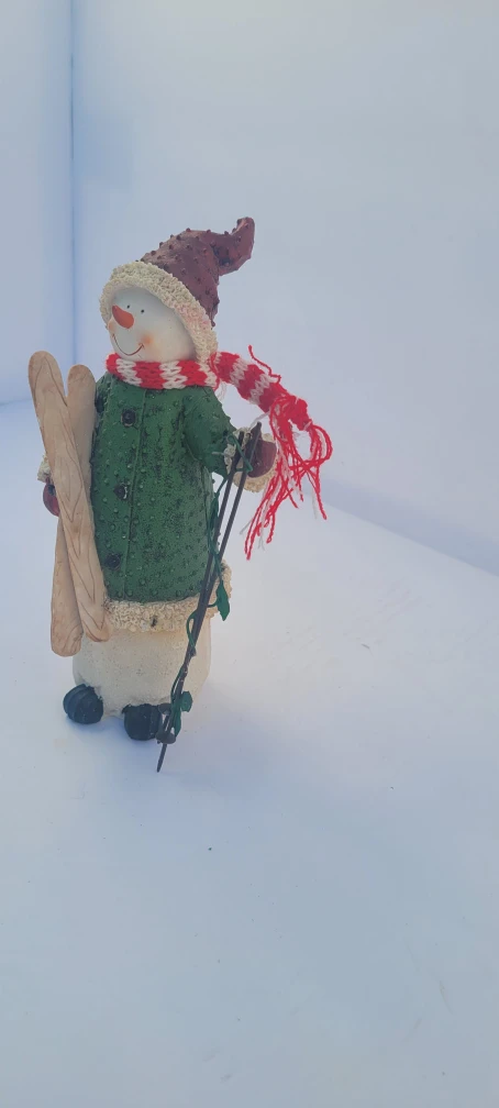 Here's a cute snowman figurine ready to hit the slopes! He's wearing a festive red and white scarf and carrying skis and poles. He measures approximately 8 inches tall, perfect for adding a touch of winter charm to your home