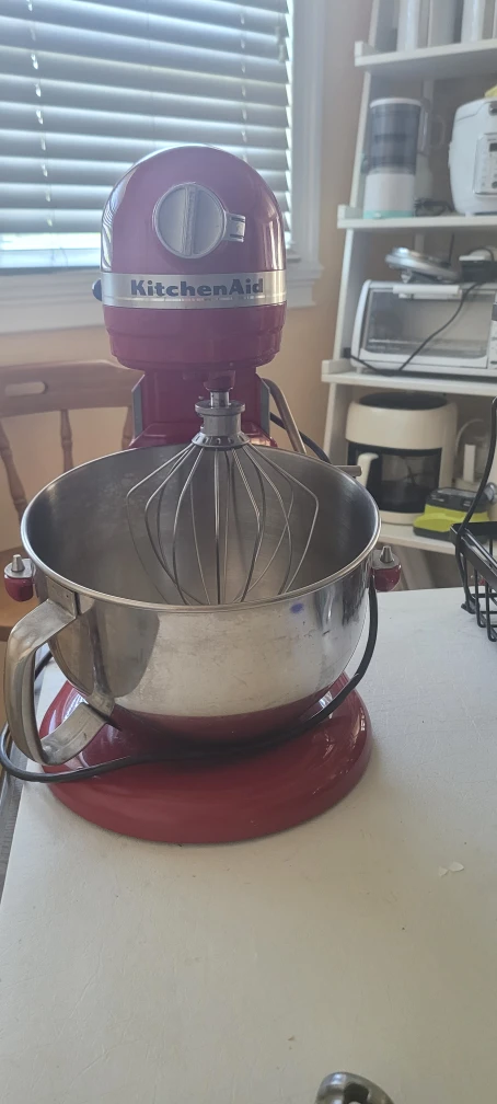 I'm selling a KitchenAid stand mixer in red! It comes with the bowl and whisk attachment as pictured. This is perfect for baking and other cooking needs. It's in great condition and ready for a new kitchen!