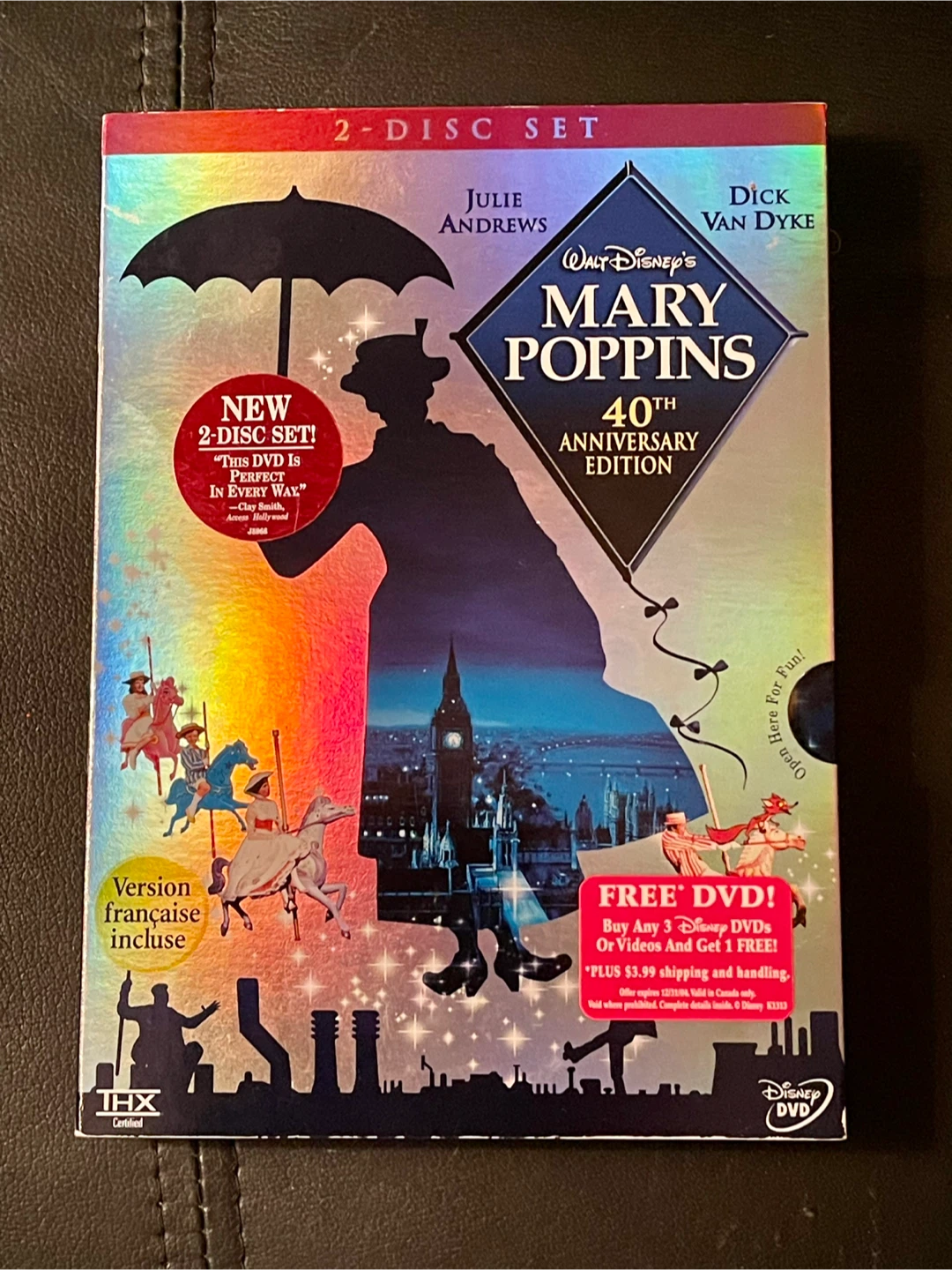 Selling a Walt Disney's Mary Poppins 40th Anniversary Edition 2-Disc DVD set. This edition includes a bonus short, music and more, games and activities, and backstage Disney features. It also has French and Spanish language tracks. Original booklet included. Both discs are tested and play perfectly.