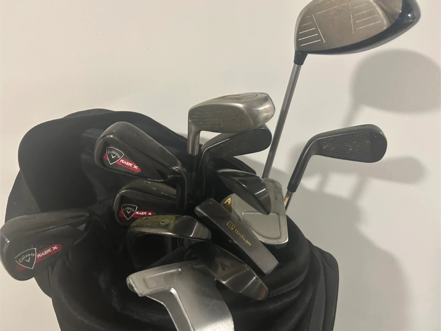 Callaway golf bag and clubs. Also included is a box of TaylorMade Project (a) golf balls.