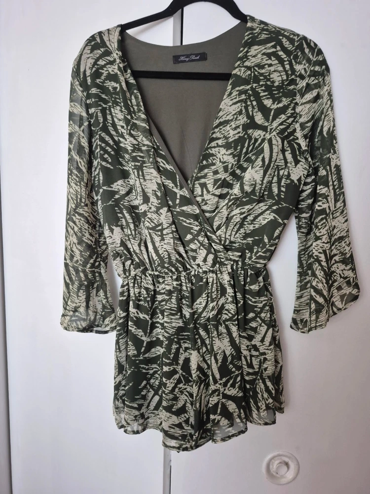 Selling a cute romper from Honey Punch! It features a stylish print and a flattering wrap design. The size is small and the colour is green. It's in great condition!