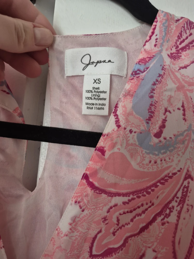 This is a Jopna dress in size XS. It features a beautiful pink floral pattern and is made of 100% polyester for both the shell and lining