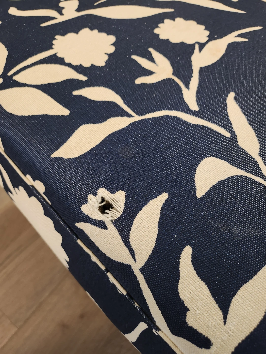 Selling a lovely accent chair with a navy and white floral pattern. It's in great condition and would look perfect in any room! The chair features a classic design with a slightly curved back for added comfort