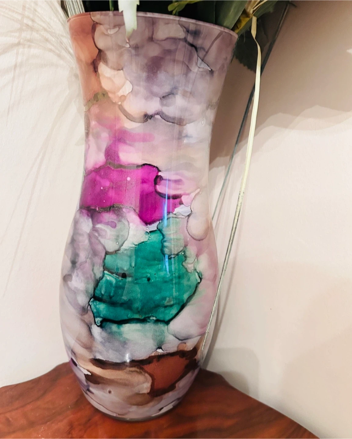 Check out this beautiful hand blown glass vase! It has a unique design with lovely colours that would look great in any room. It's in great condition and ready for a new home!