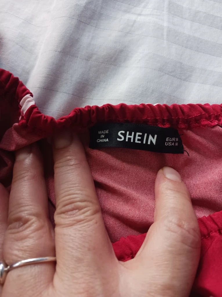 This is a red dress from Shein in size M. It has a cute pattern of white hearts. It's in great condition and ready for a new owner!