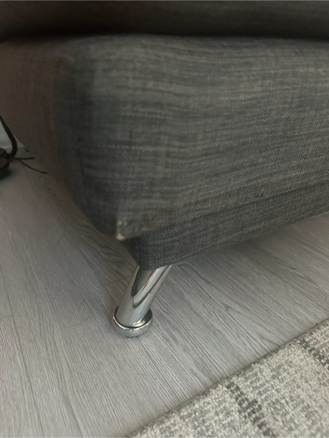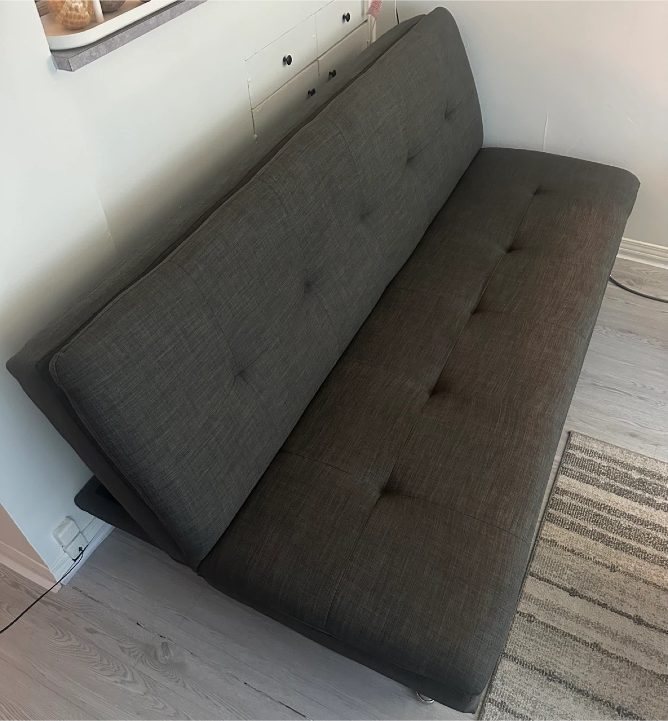 Selling a comfy grey futon sofa bed. It's in good condition and would be great for a living room or guest room. The material is a durable fabric, and it has a sleek, modern look with button detailing. The legs are chrome. It easily folds down into a bed for extra sleeping space!