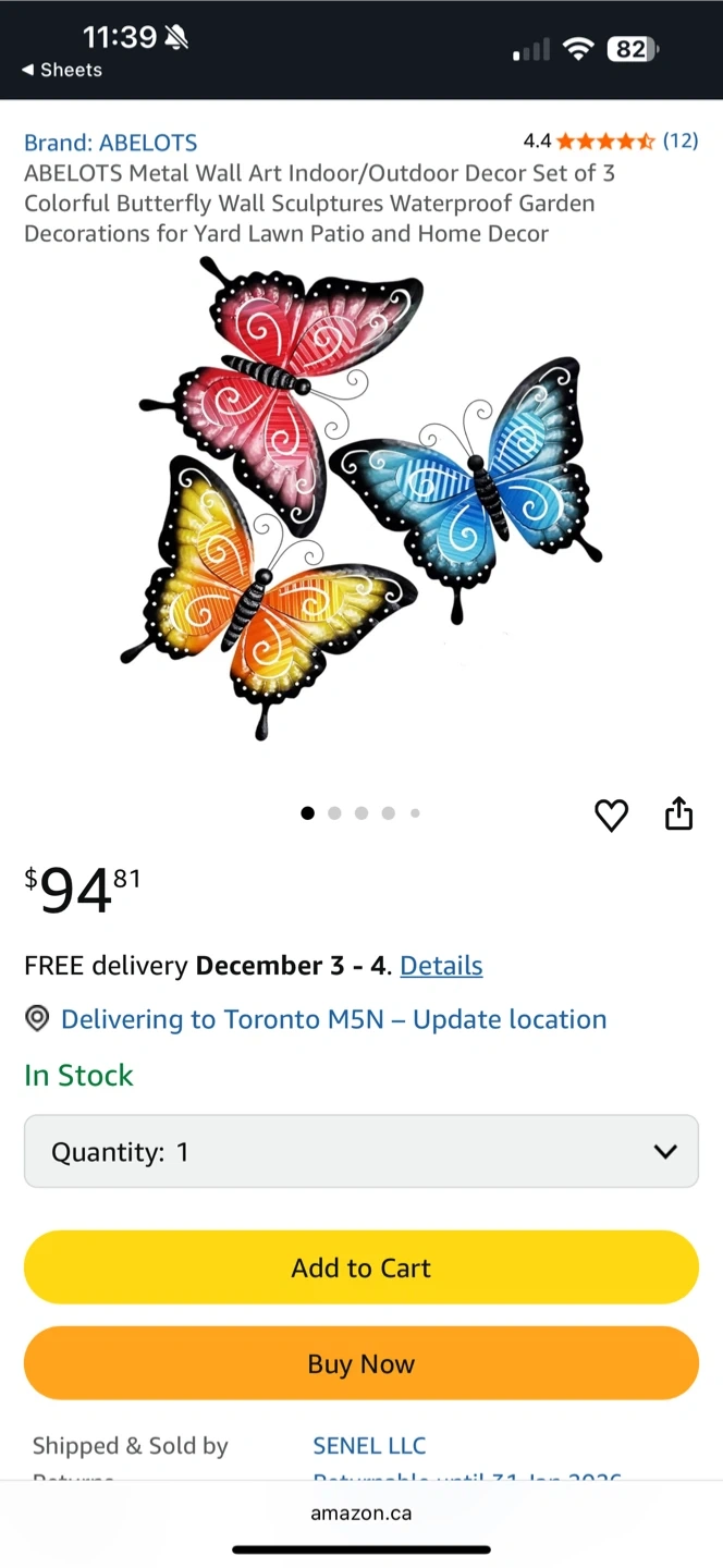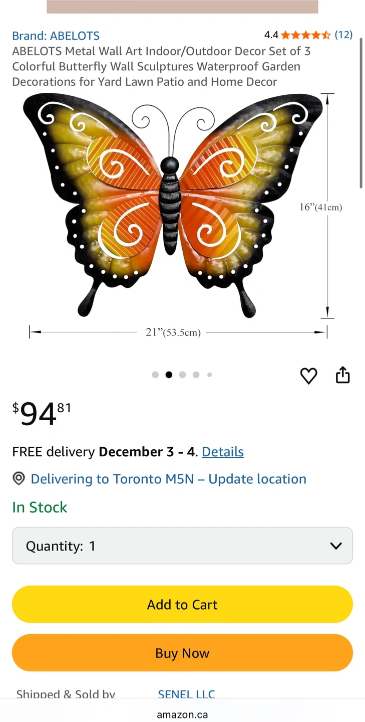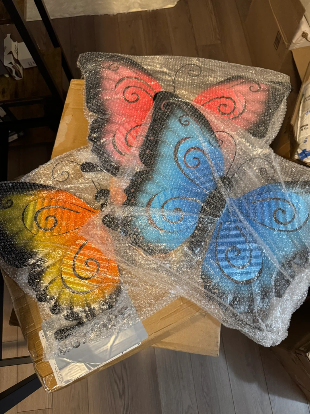 Here's a set of three colourful butterfly wall sculptures by ABELOTS. They're waterproof and great for garden decorations, patio, or home decor. They're still in the original packaging!