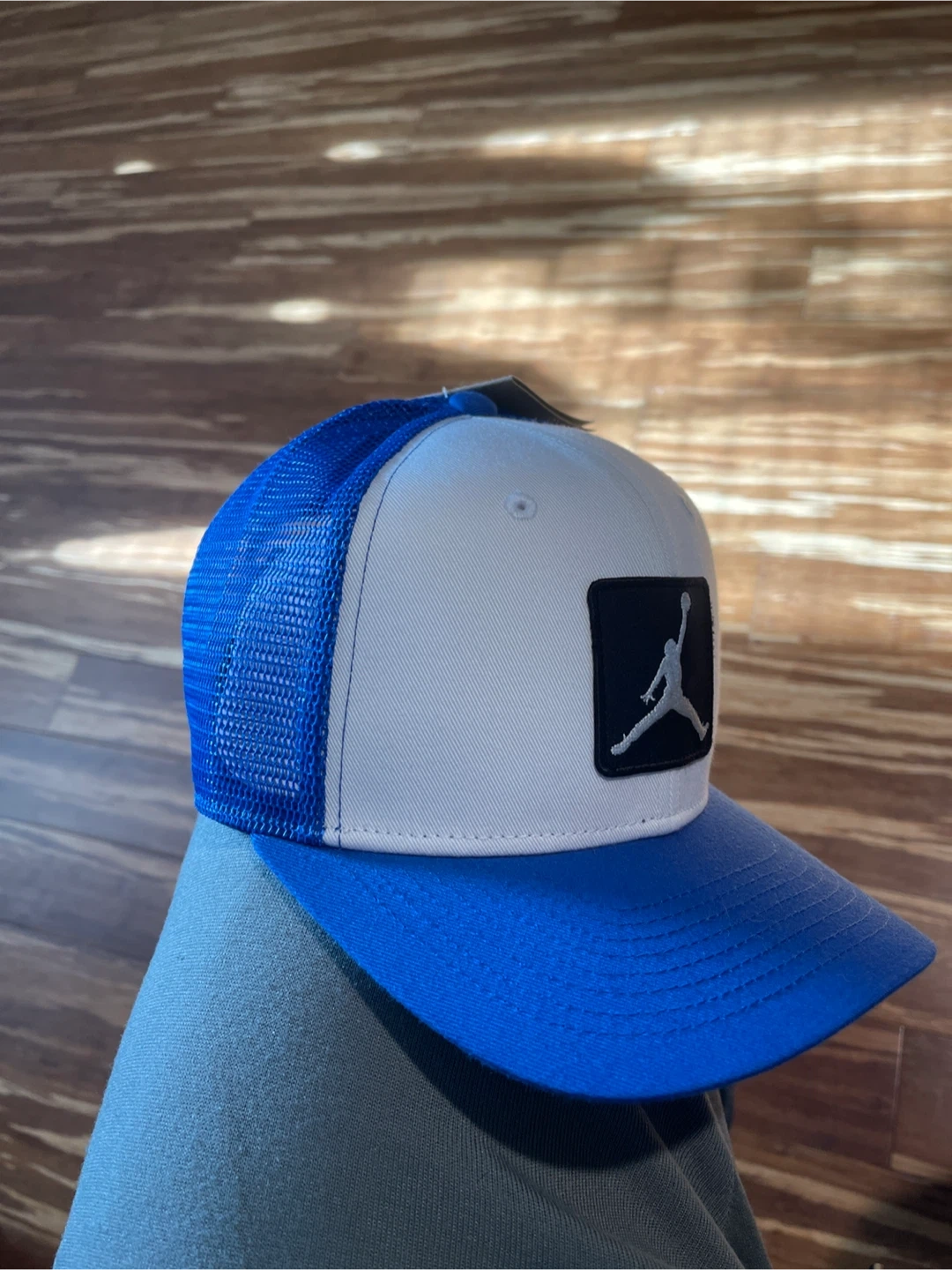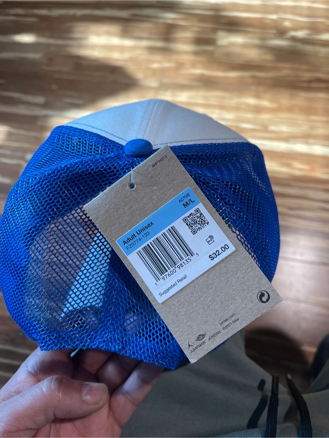 This is a Nike Jordan Adult Unisex Hat in blue and white, SnapBack The tag shows a suggested retail price of $32.00. It's in great condition!