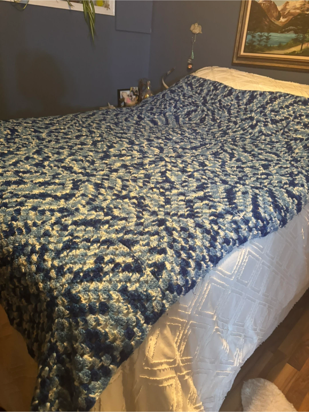 Cozy up with this beautiful blue crocheted blanket! It's perfect for adding a touch of warmth and handmade charm to any room. The intricate crochet work features a lovely pattern of blues and whites.