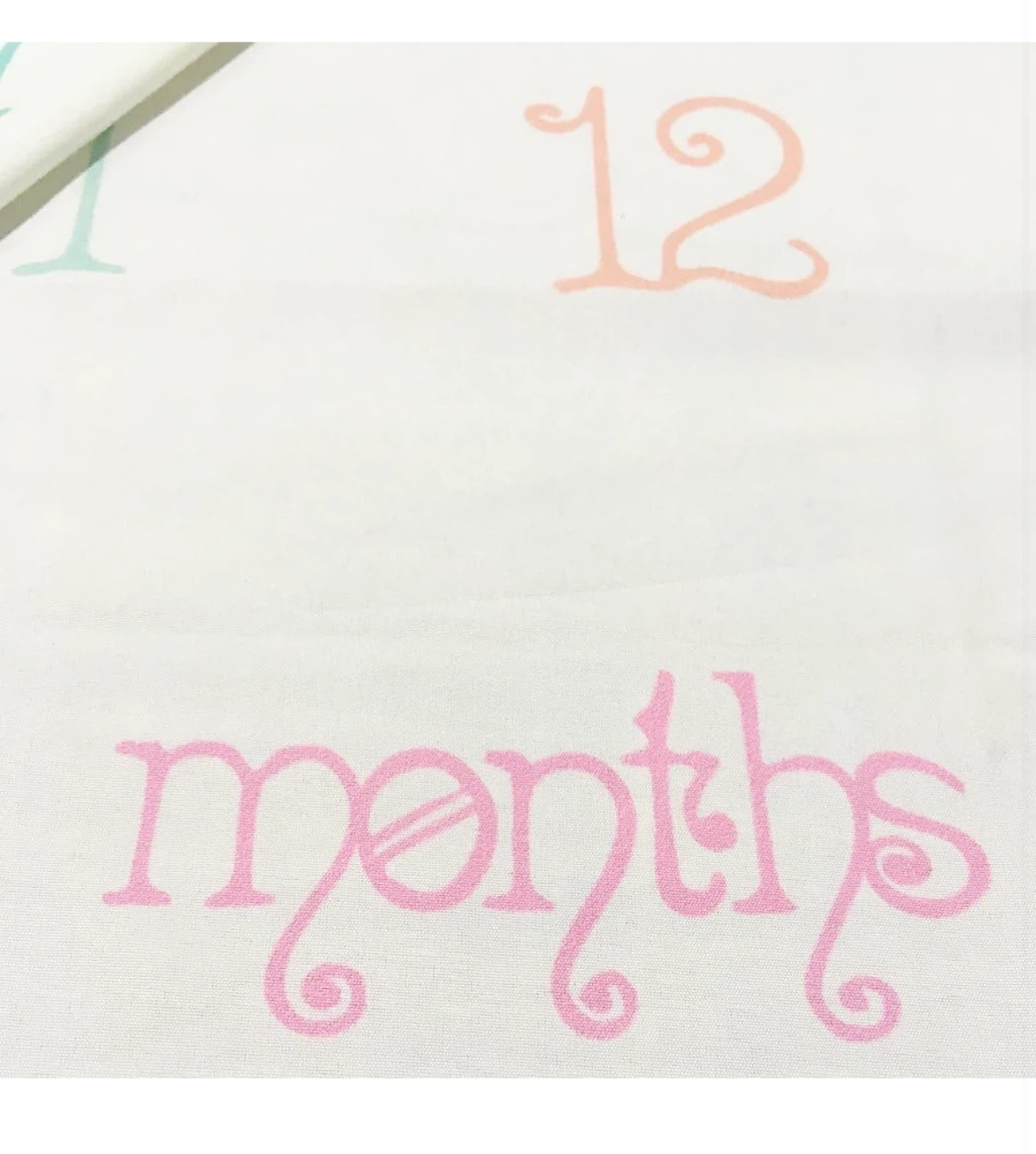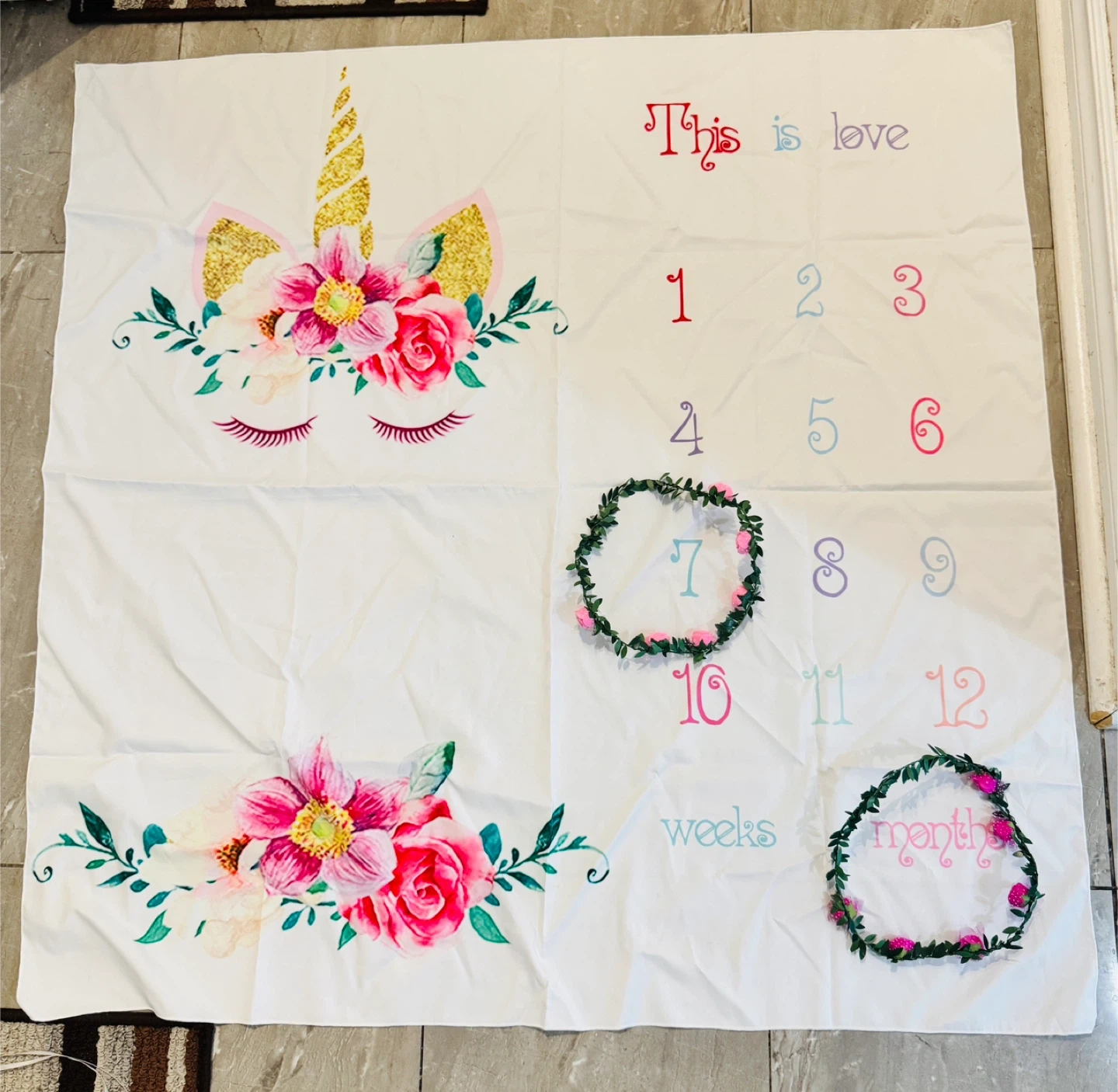 This is a super cute baby milestone blanket with a unicorn design! It comes with two little wreaths to mark the weeks and months as your baby grows.