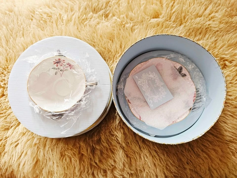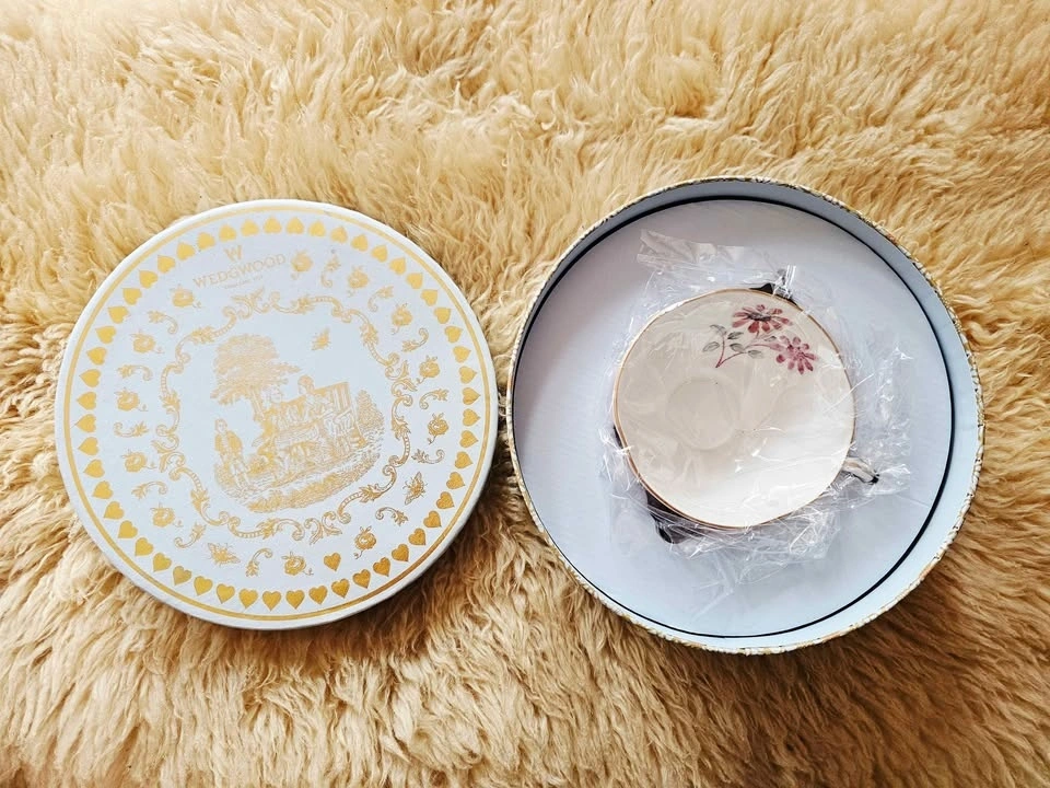 Cup and saucer are brand new and have only been removed from the original packaging for listing photos. Box shows light signs of wear from sitting in storage but is still in giftable condition.