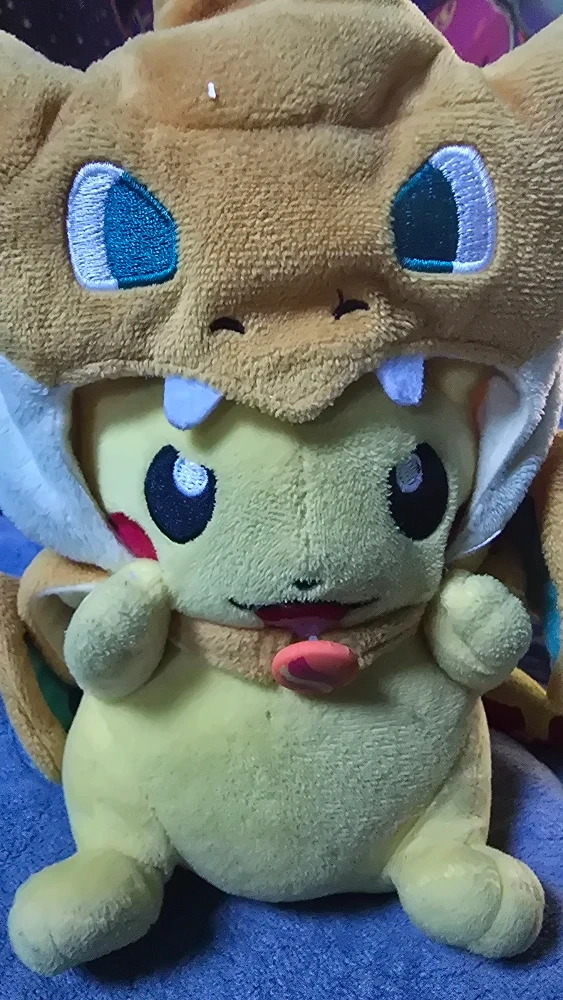 Cute Pikachu plushie wearing a Charizard hoodie! It's in great condition and ready for a new home. Perfect for any Pokémon fan