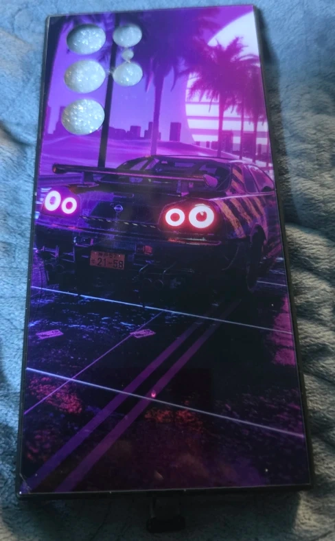 Cool phone case featuring a Nissan Skyline R34 with a retro wave design! The case has a black border and camera cutouts. Check out the photos for the design and condition