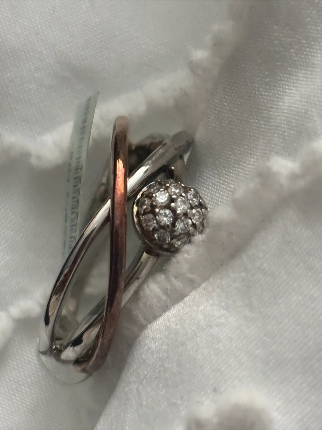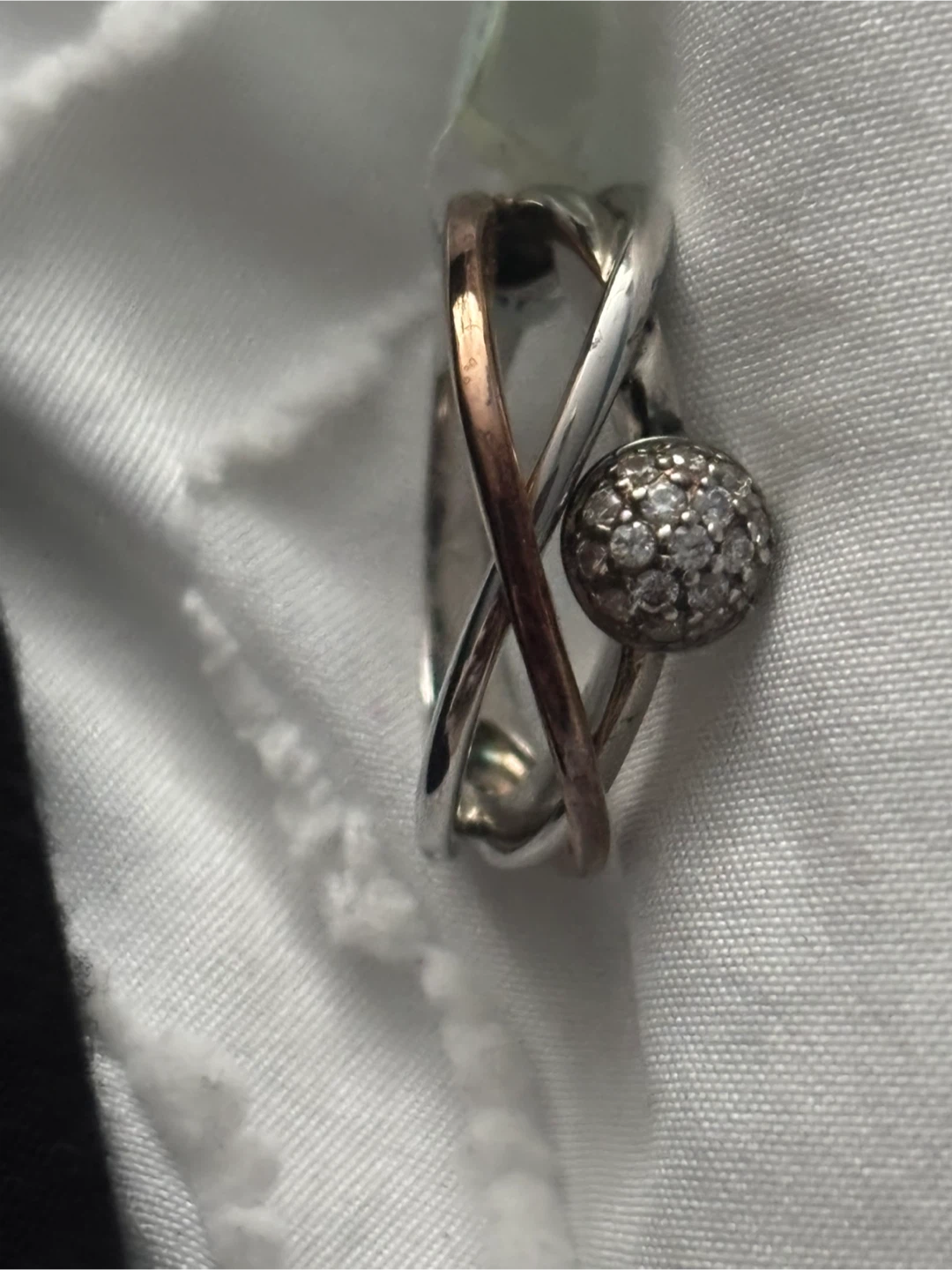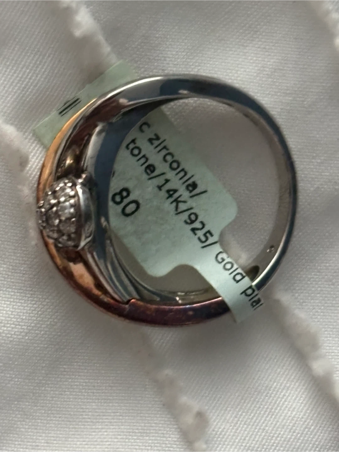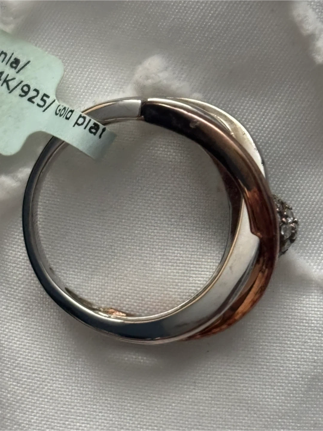 Selling a beautiful designer ring! It features cubic zirconia accents and is plated with 14K gold over 925 sterling silver. The ring is a size 9 and has a unique design with a mix of silver and rose gold tones. It's in great condition and ready to add a touch of sparkle to your collection