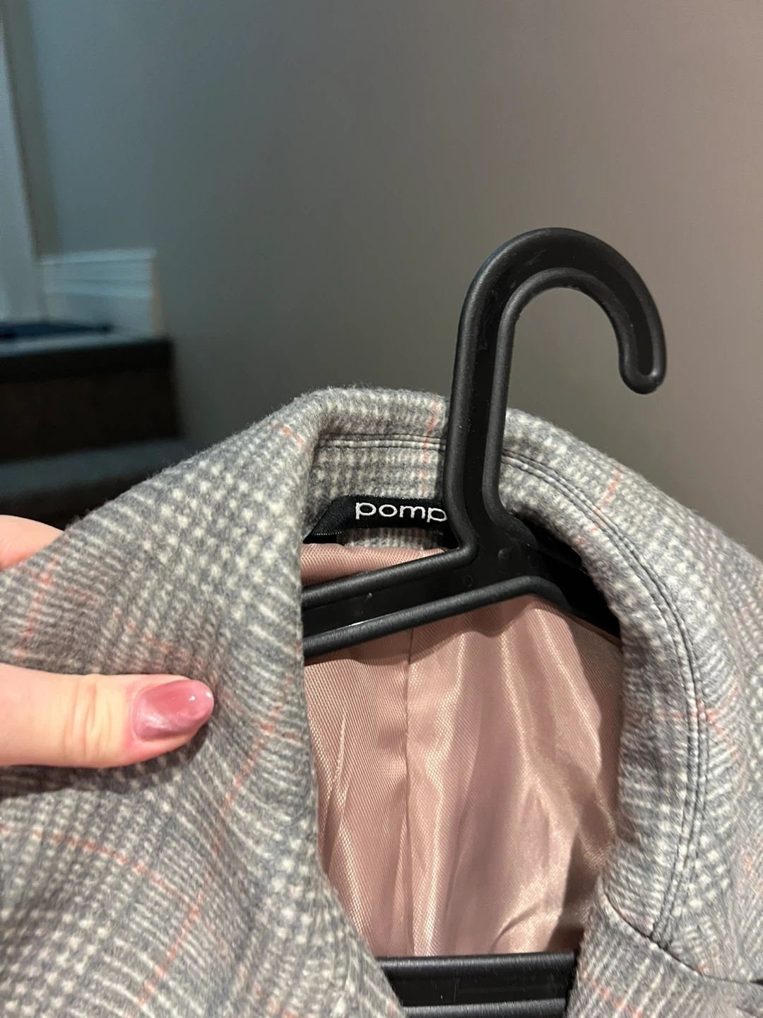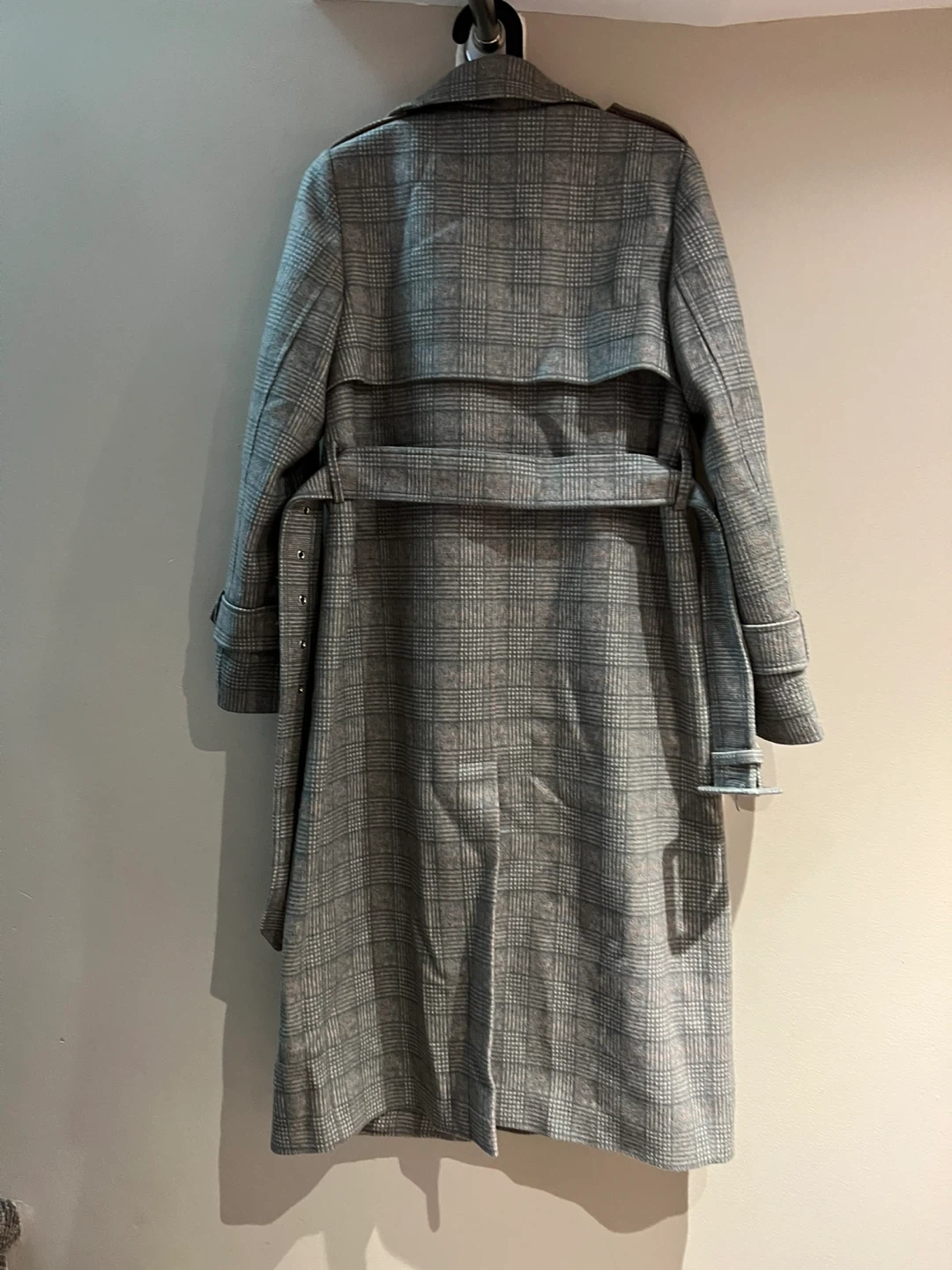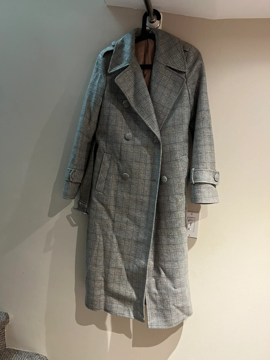 Selling a stylish POMP plaid trench coat in size small. It's in great condition and perfect for layering during the cooler months. The classic plaid pattern adds a touch of sophistication to any outfit! I hope it finds a good home