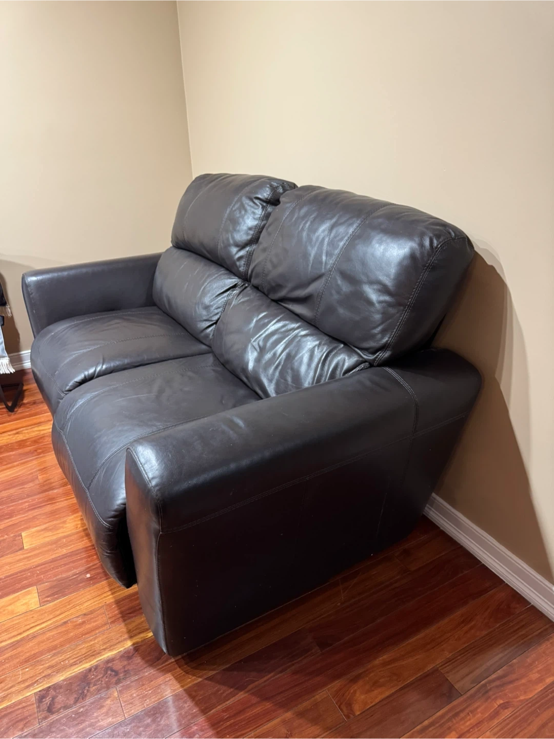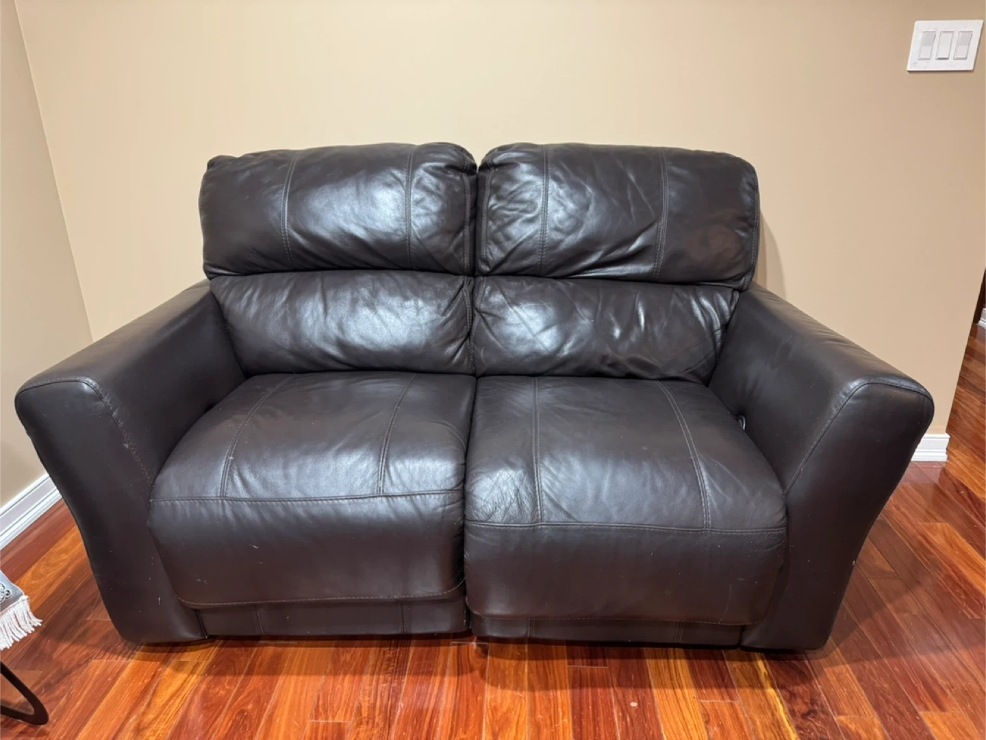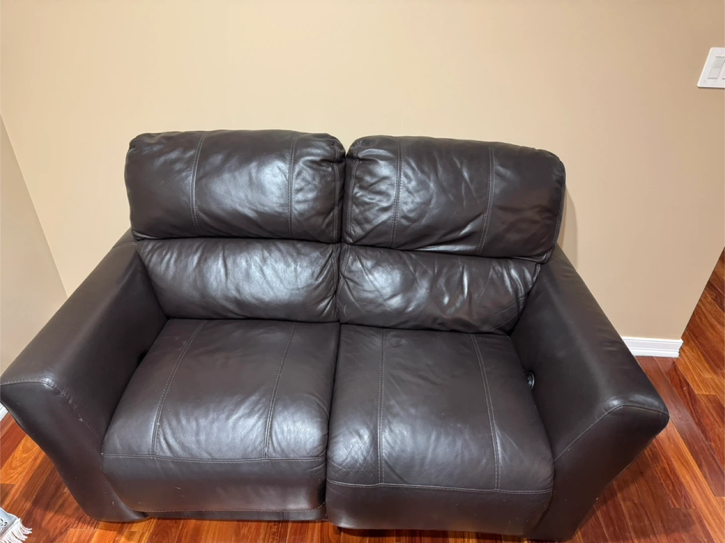 Selling a comfortable dark brown reclining loveseat . It's in good condition and perfect for a smaller space or apartment. This loveseat is made of genuine leather(Romanian) and is a great addition to any living space. Purchased from Macy’s.