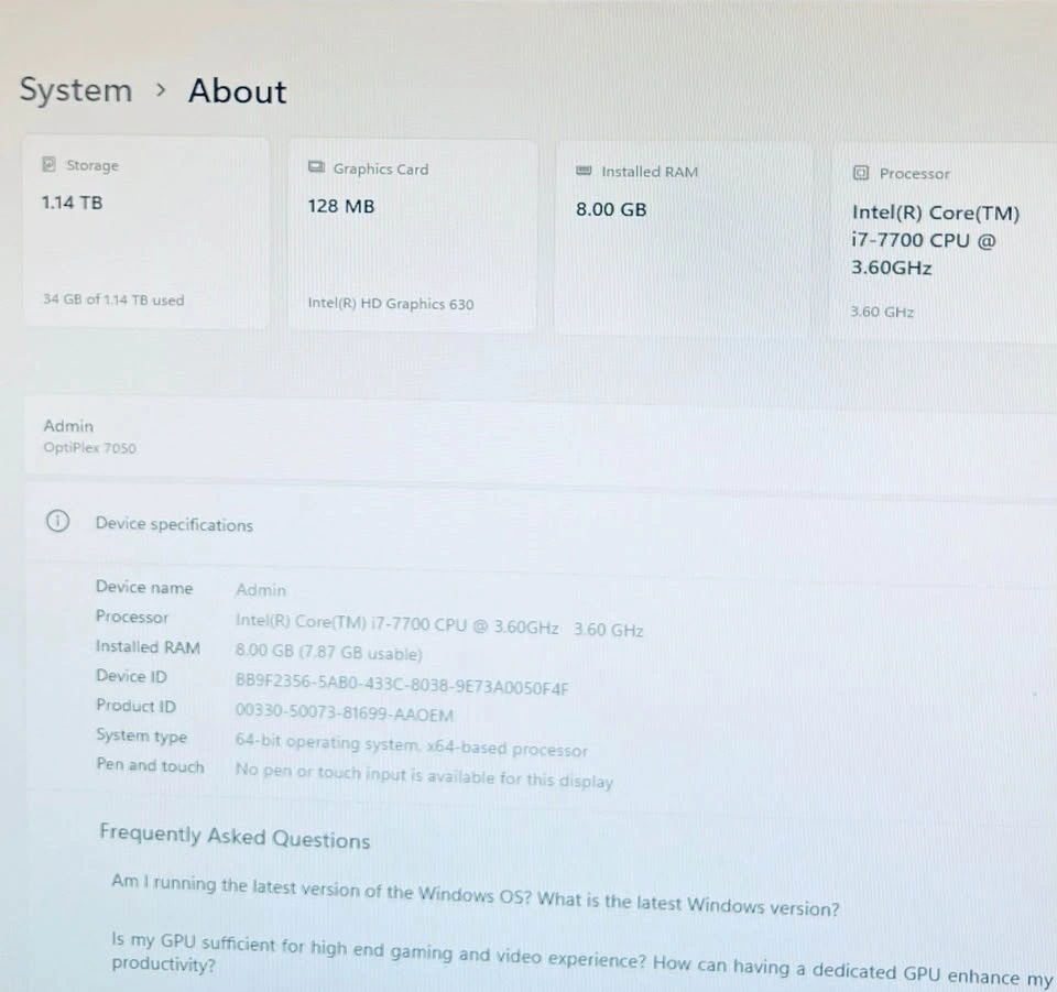 Hello, I am selling a Dell Optiplex 7050 PC with Windows 11 Pro. I factory reset it, so it's like new with all accounts and data removed. It is in excellent condition and fully functional; you can come and test it out with no issues. The monitor is not included.