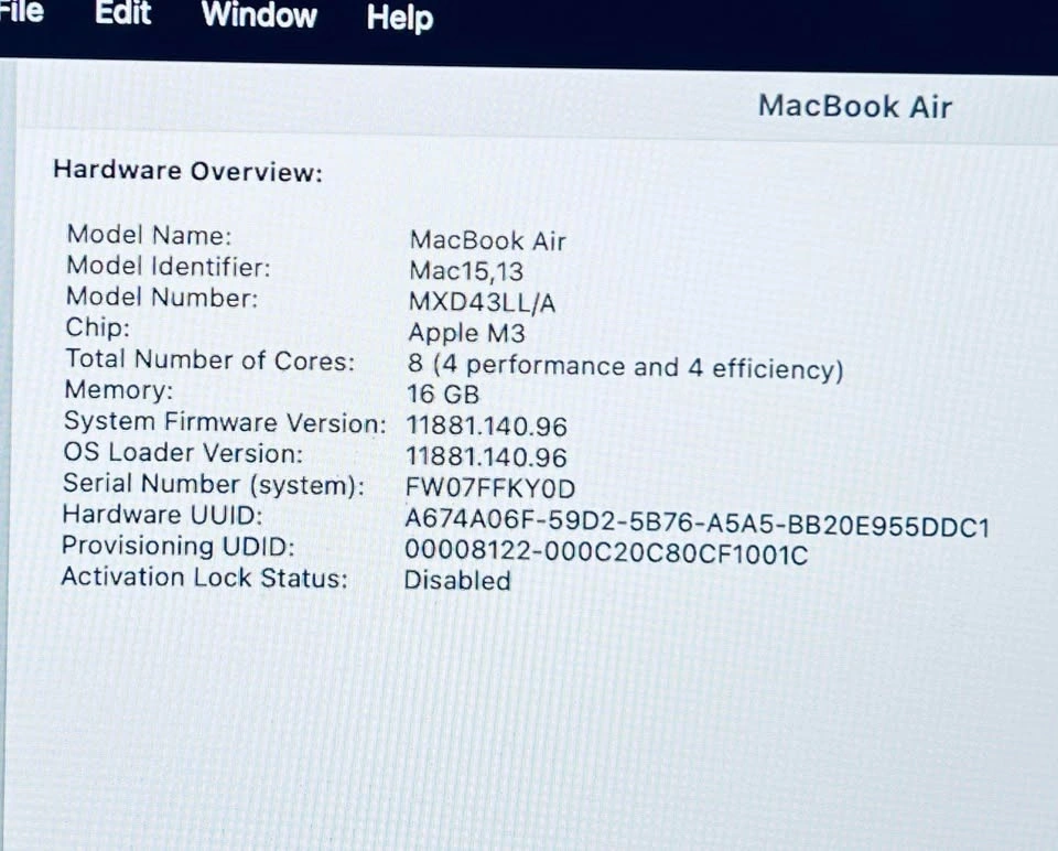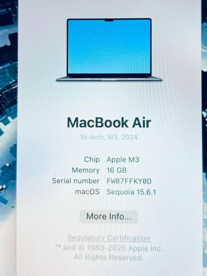 Hi, I am selling an Apple Macbook Air 15”, 2024, with the M3 Chip. I factory reset it, so it’s like new, and all accounts and data are removed. It is fully functional; you can come and see it before purchasing. Excellent Condition