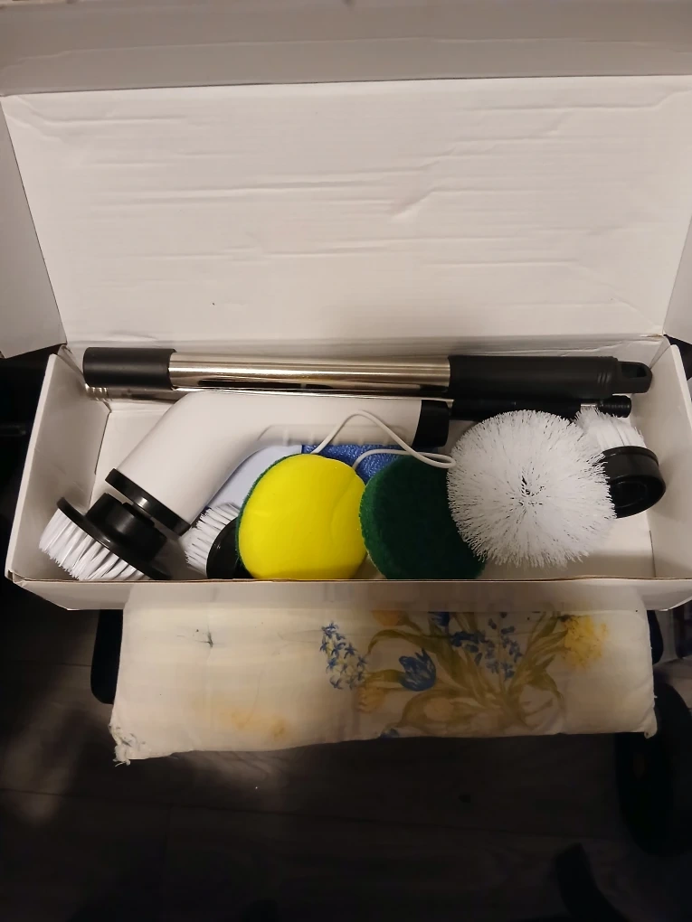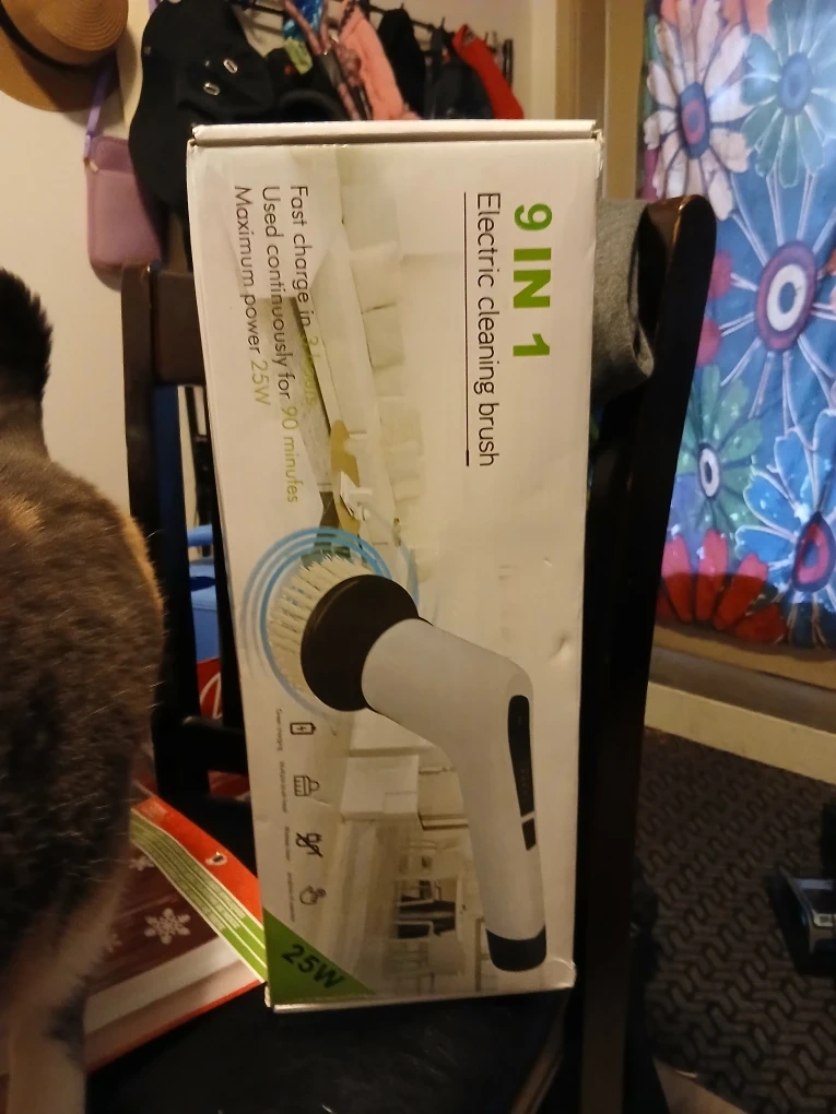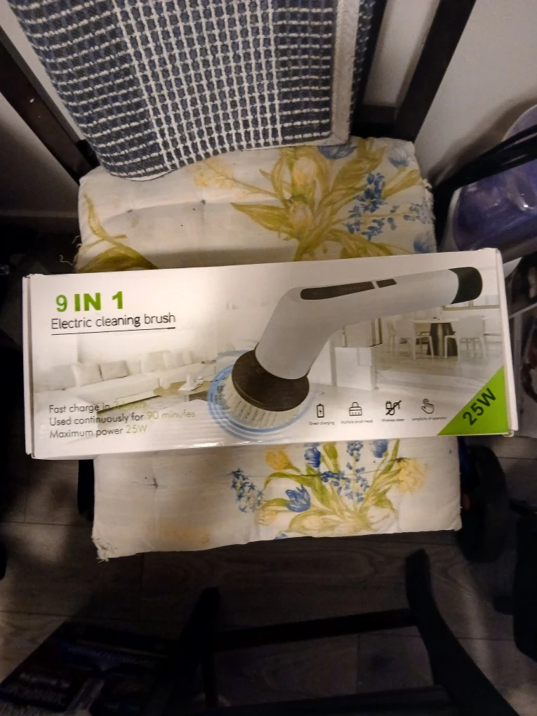 Selling a brand new 9 in 1 electric cleaning brush still in its original box! It comes with multiple brush heads, and it's wireless for easy use around the house. The box says it charges fast and can be used continuously for 90 minutes, with a maximum power of 25W. Perfect for getting those hard-to-reach spots!