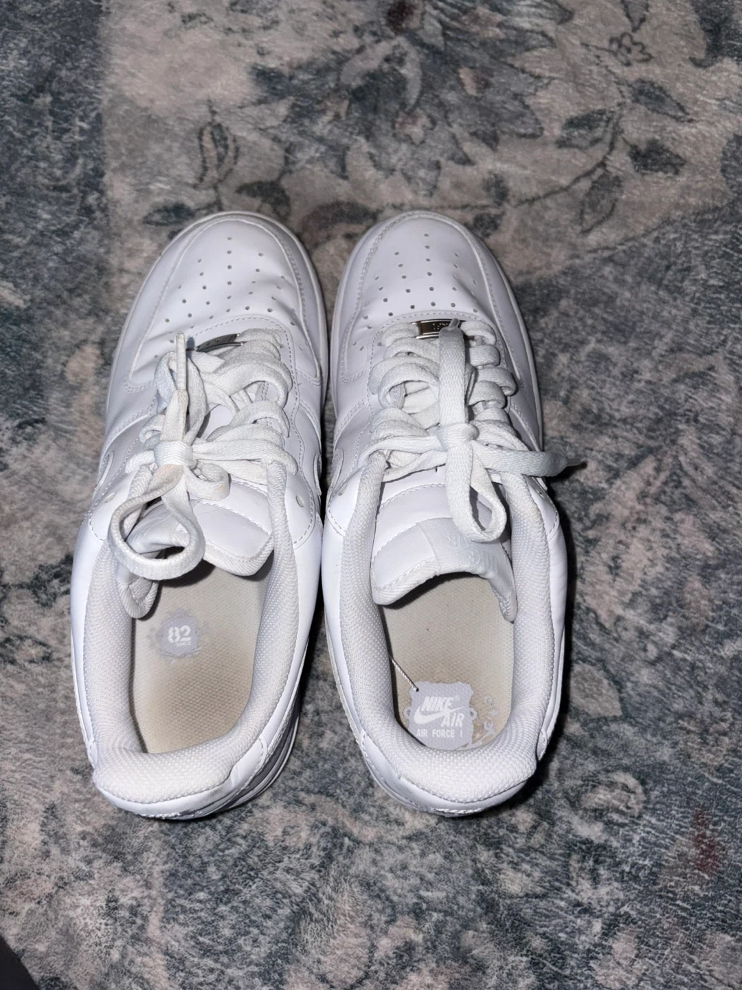 Selling a pair of classic Nike Air Force 1s in white. These are a timeless style and would look great with any outfit! They're in good condition and ready for a new owner