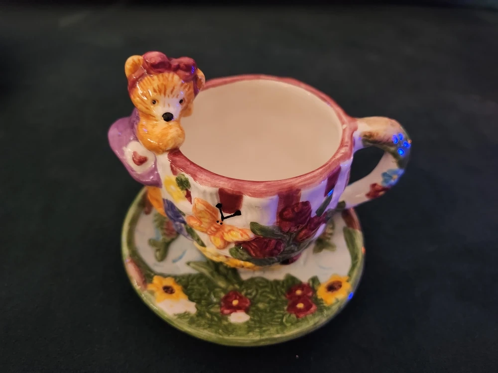Super cute vintage tea cup and saucer set! It features a sweet bear figurine and a colourful floral design. Perfect for adding a touch of whimsy to your tea time or displaying as a charming collectible