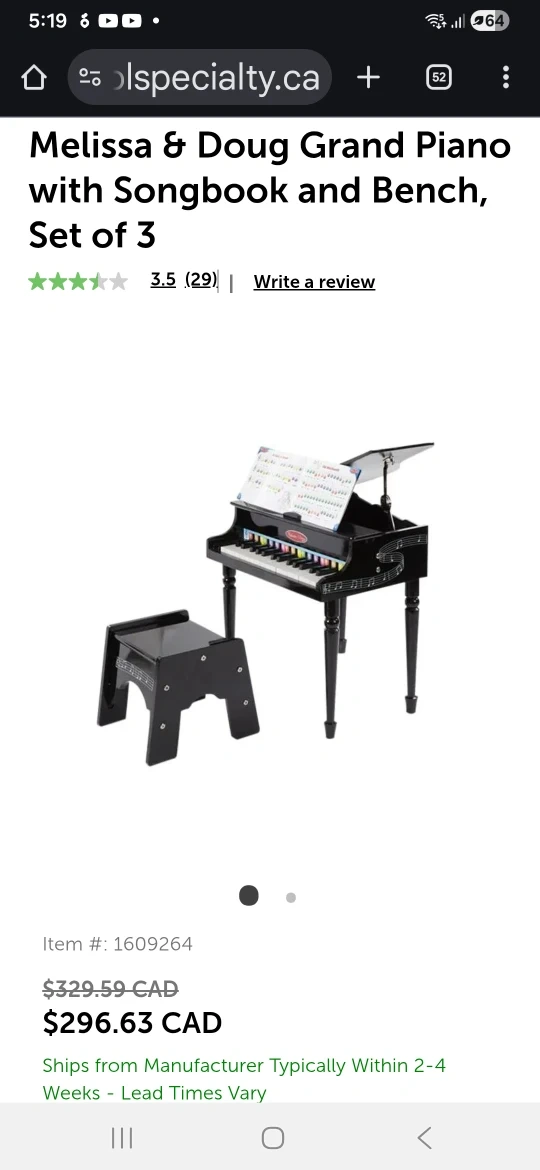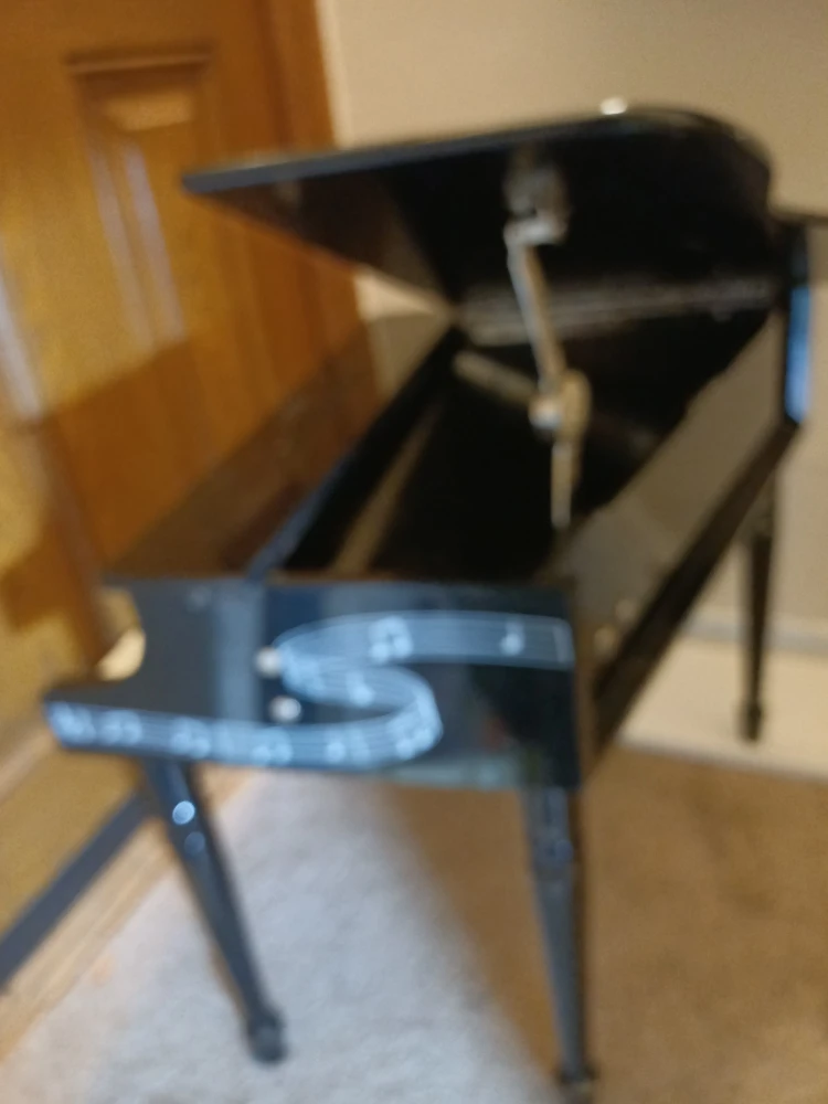 Melissa & Doug toy piano in black. It's a great way to introduce music to your little one. It comes with the seat shown in retail pics.