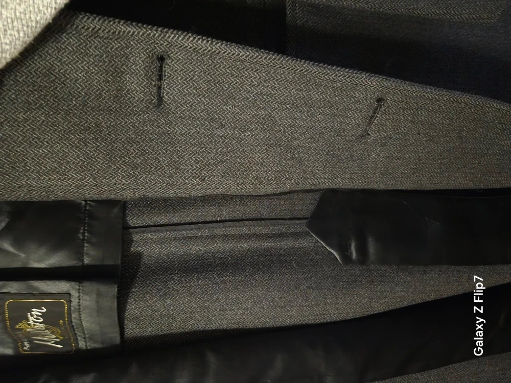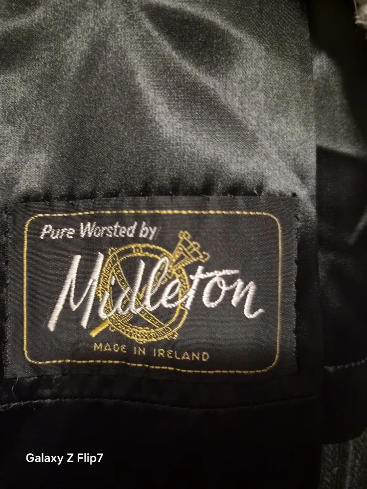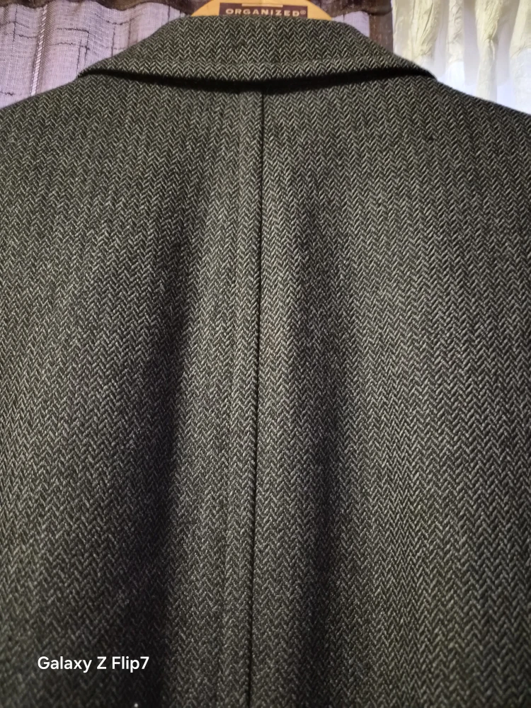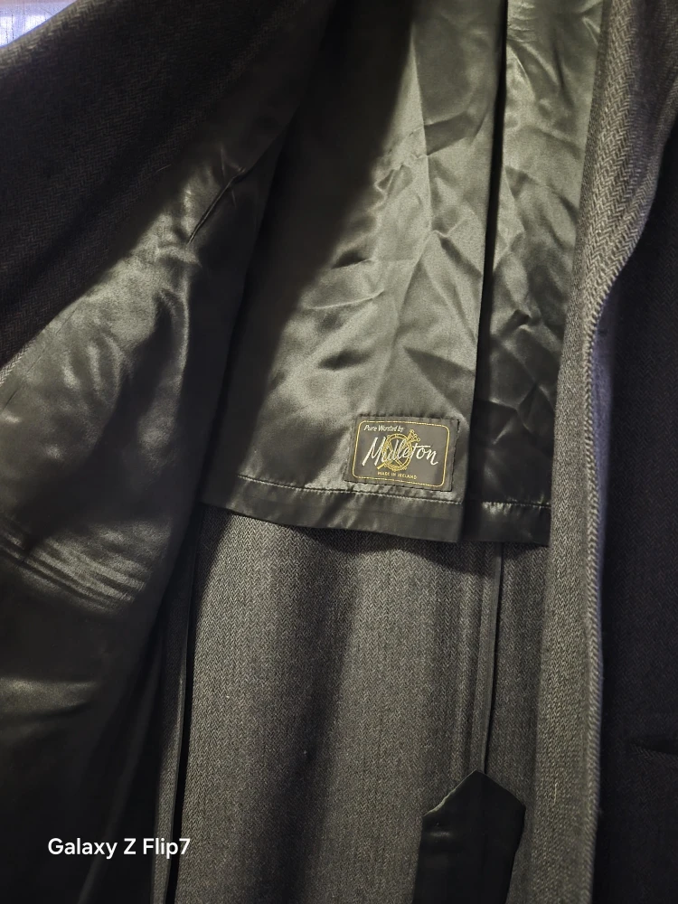 Selling this tailor made overcoat of pure worsted wool by Midleton crafted in Ireland! The overcoat is a dark gray, it has a classic harringbone design and is in pristine condition. It's a timeless piece that would make a great addition to your wardrobe.