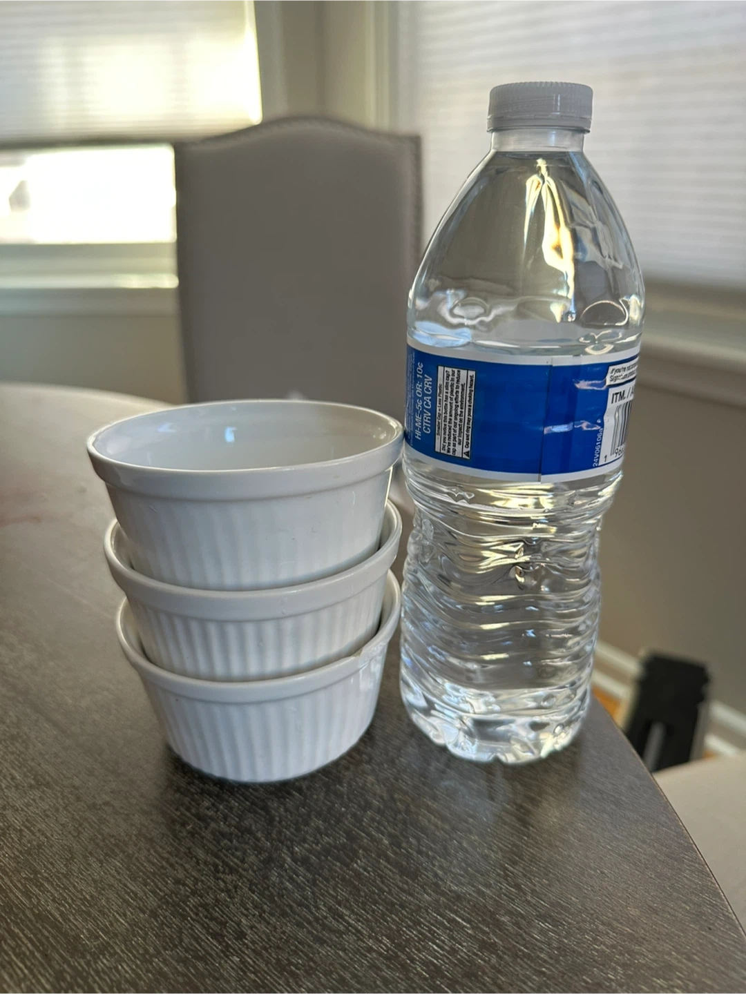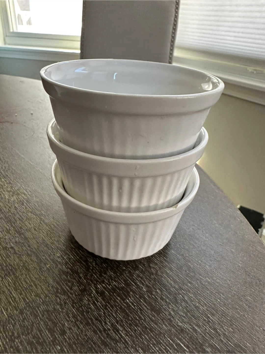 Giving away a set of 3 white ramekins. They're perfect for baking individual desserts or serving dips and sauces. One of the ramekins has a crack. 3.5” diameter