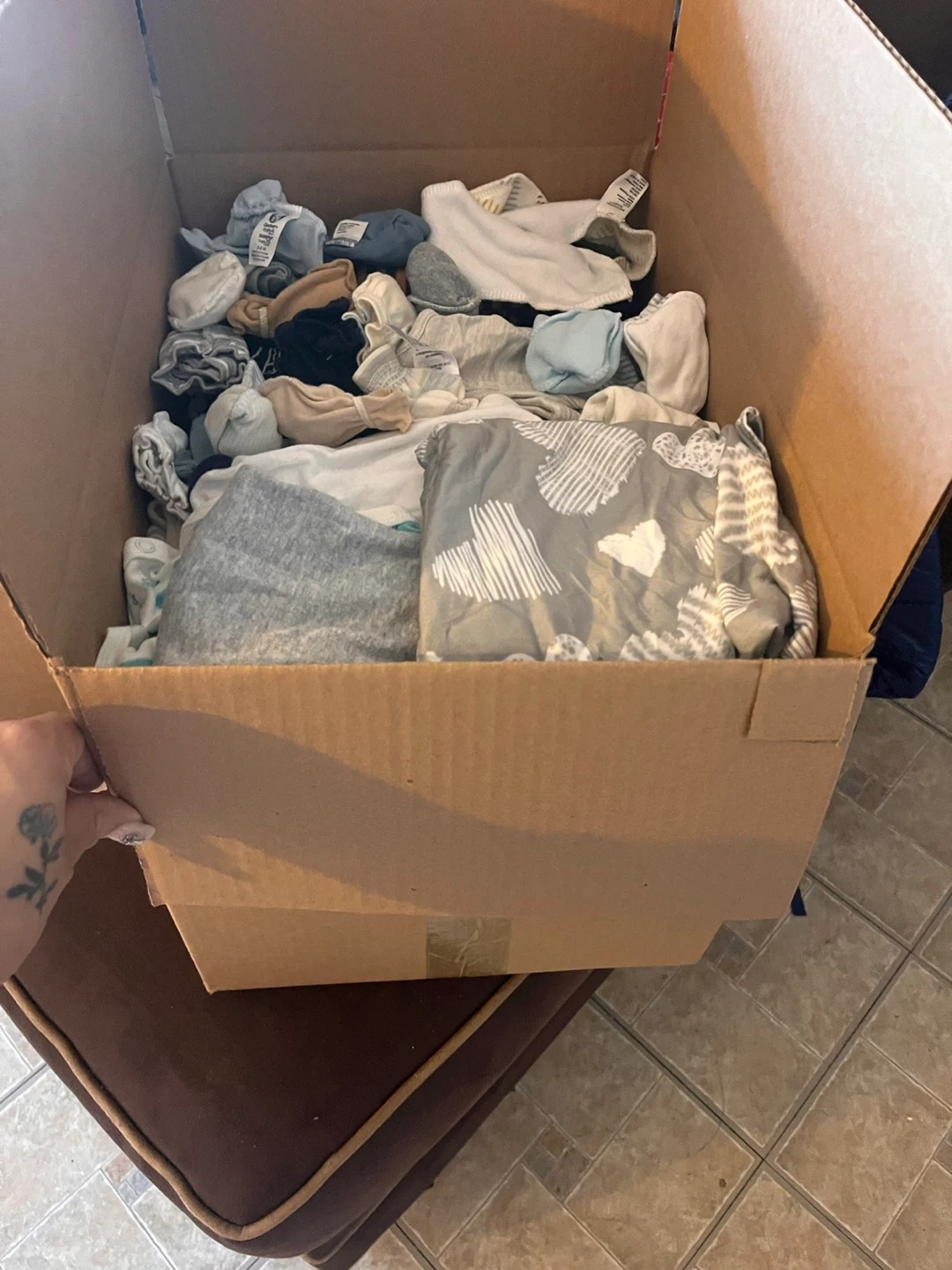 There's a mix of boy & girl clothes(More girls) ,sizes (0-12 Mons) and different brands. perfect for stocking up on essentials for your little one. All items are in good condition one box is full of 1 or 2 uses/wear and the other box is brand new items never worn ..