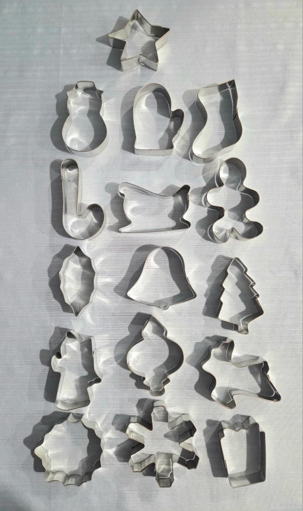 Never used 14-piece set of Christmas cookie cutters! Includes a variety of festive shapes like a star, snowman, mitten, stocking, candy cane, sleigh, gingerbread man, bell, Christmas tree, angel, ornament, reindeer, flower, snowflake, etc..