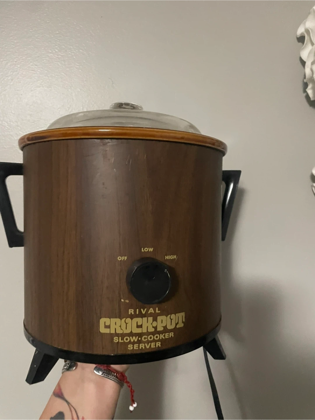 Selling a Rival Crock-Pot slow cooker server. It's in great condition and ready for your next gathering! It has settings for off, low, and high. It features a wood grain exterior and a glass lid.