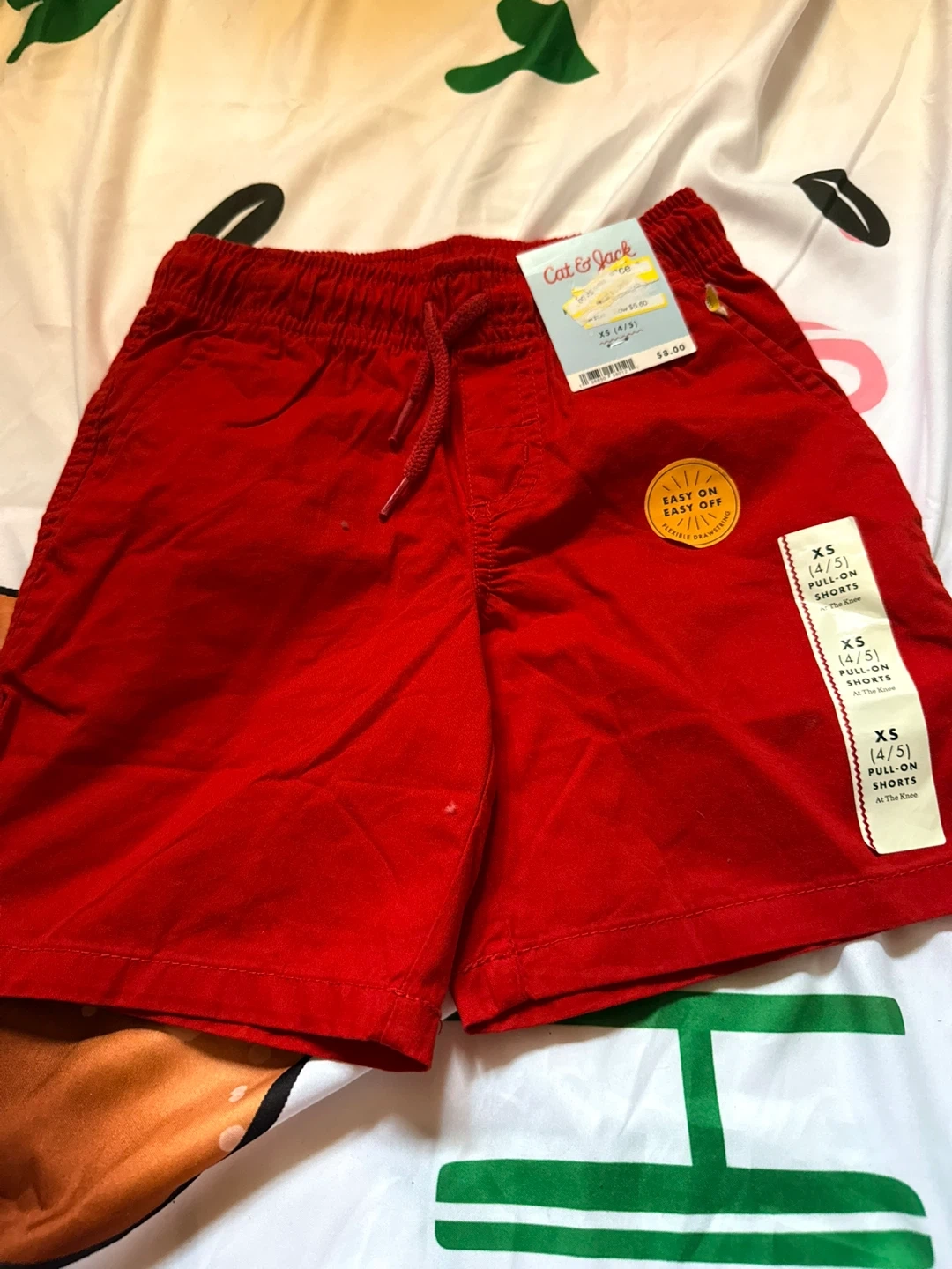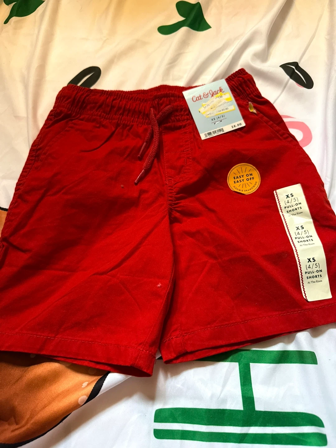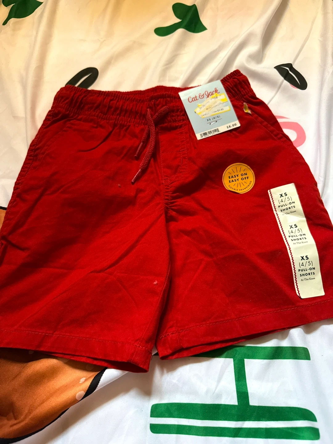These Cat & Jack shorts are in great condition and ready for a new adventure! They're a vibrant red color and size XS (4/5). They feature a comfortable elastic waistband with a drawstring for a perfect fit. Easy to put on and off!