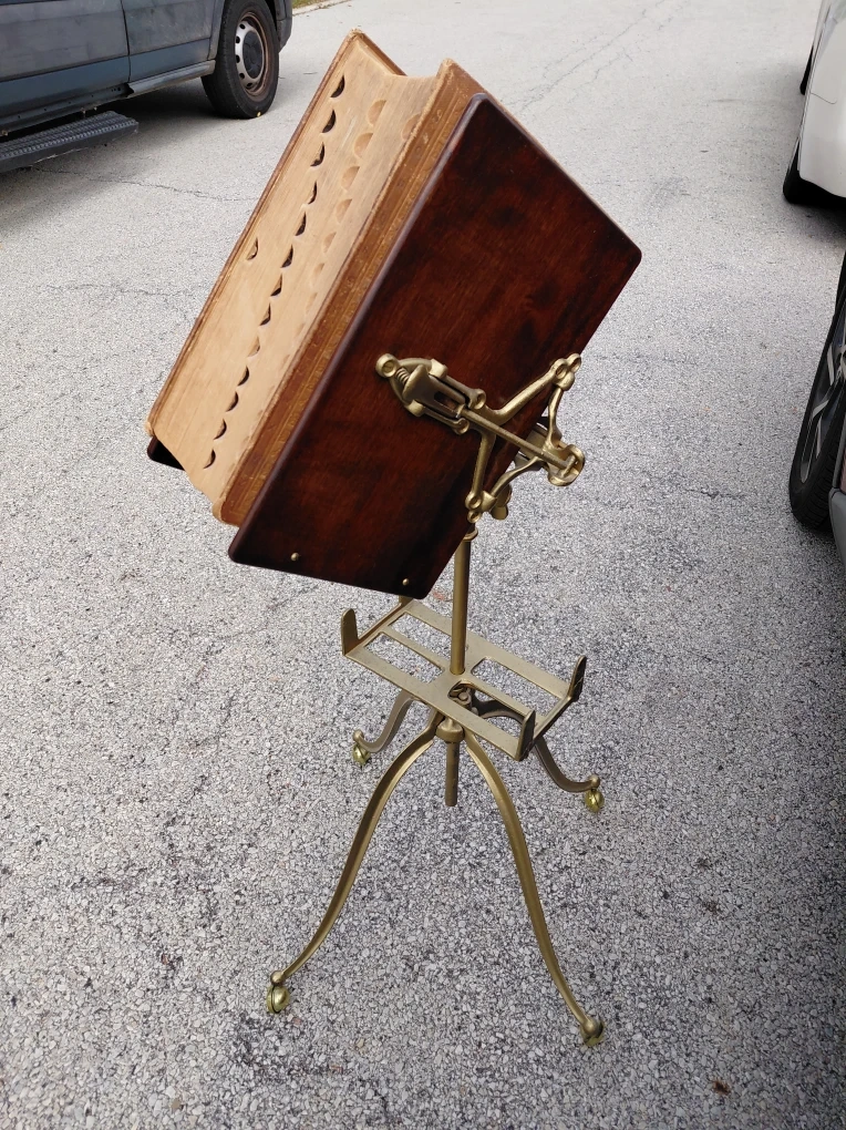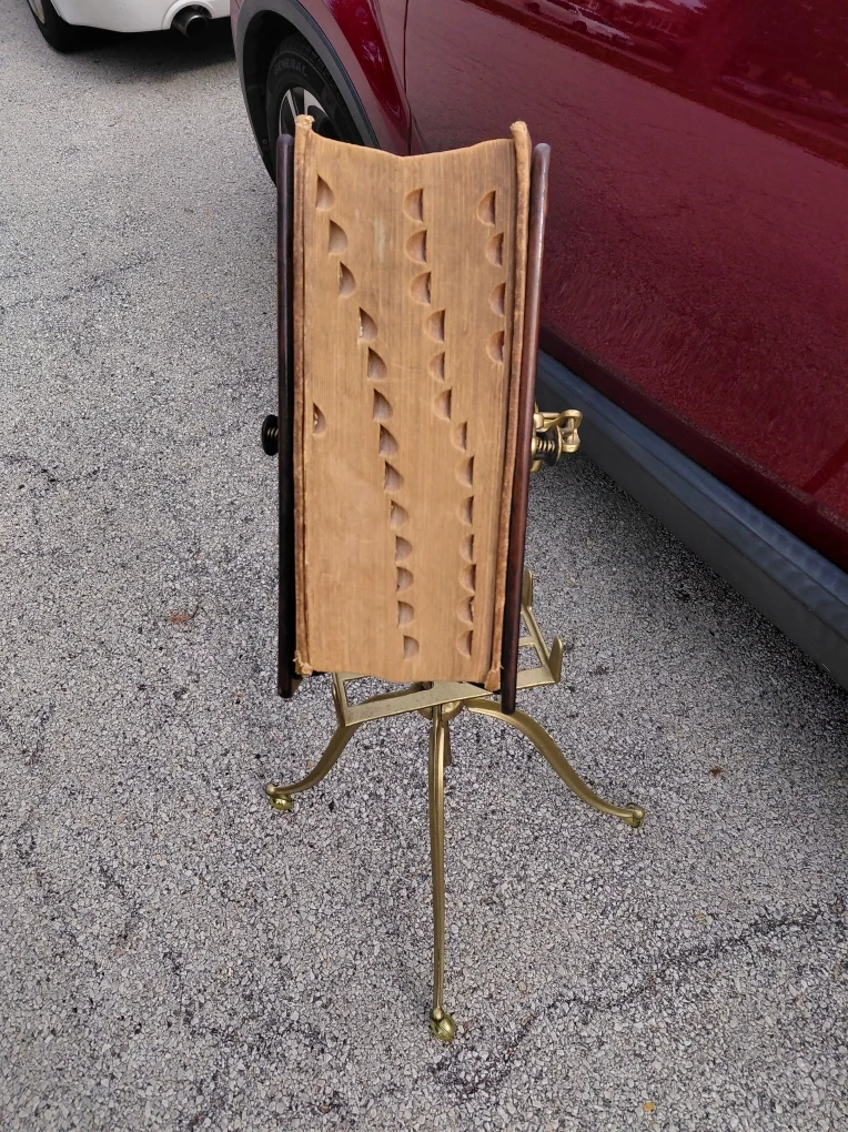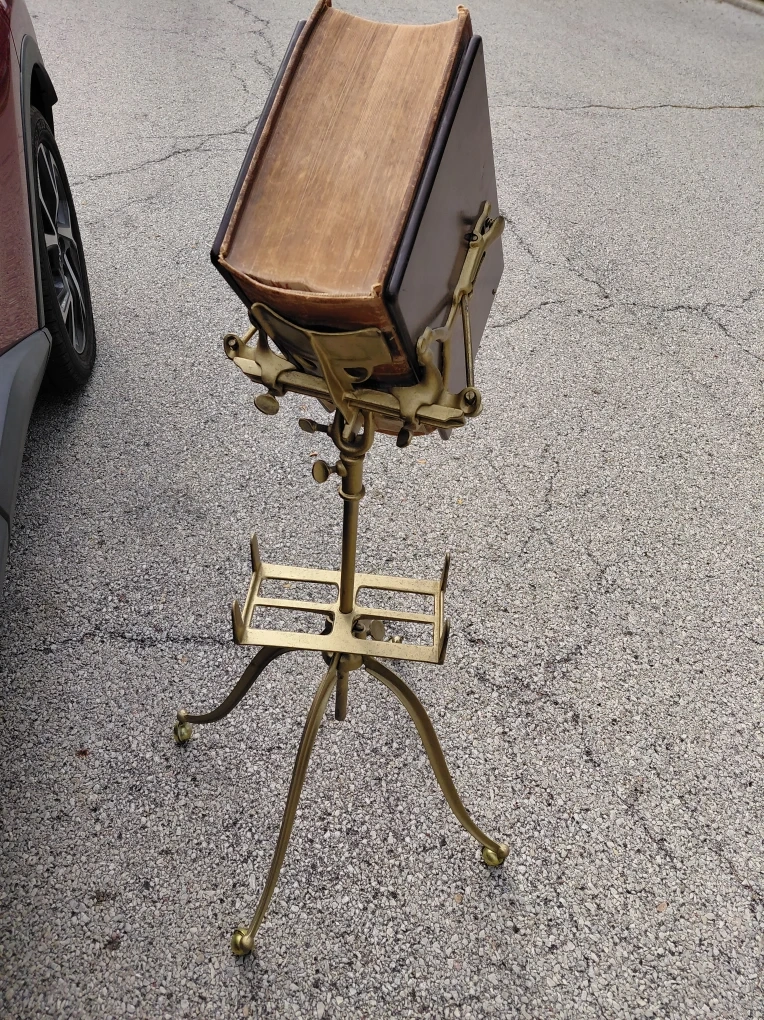 Selling an antique book stand. It appears to be made of wood and brass. Great for displaying large books!