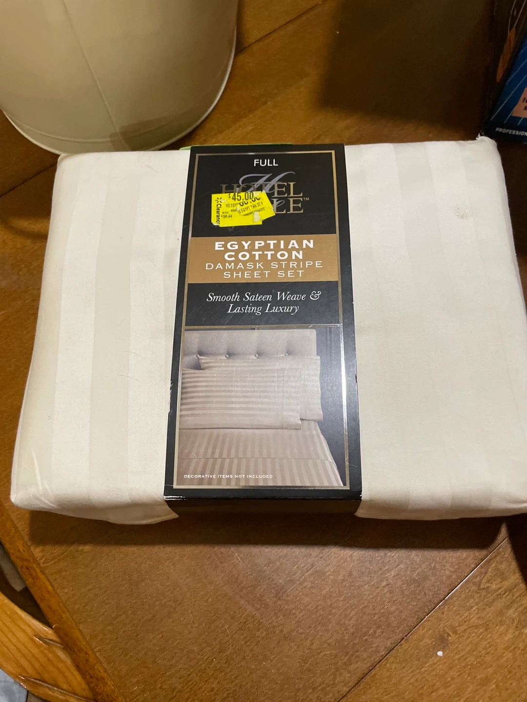 Selling a brand new Hotel Style Egyptian Cotton Damask Stripe Sheet Set in Full size! It's still in the original packaging.