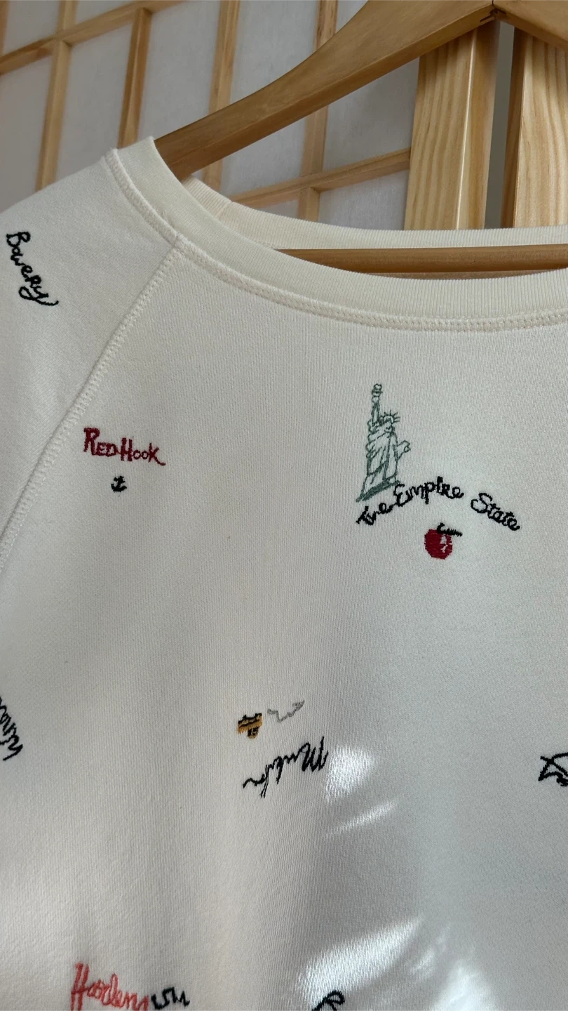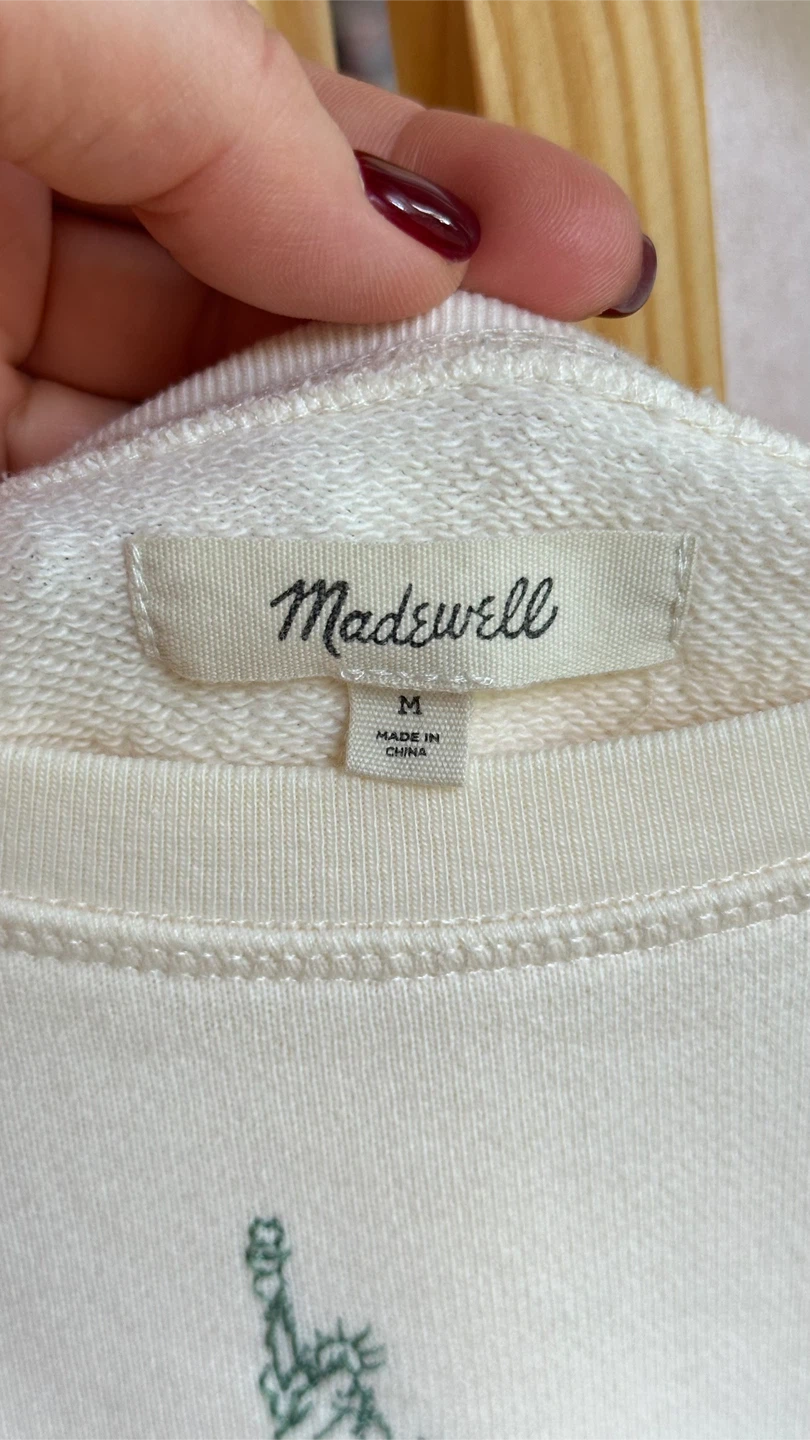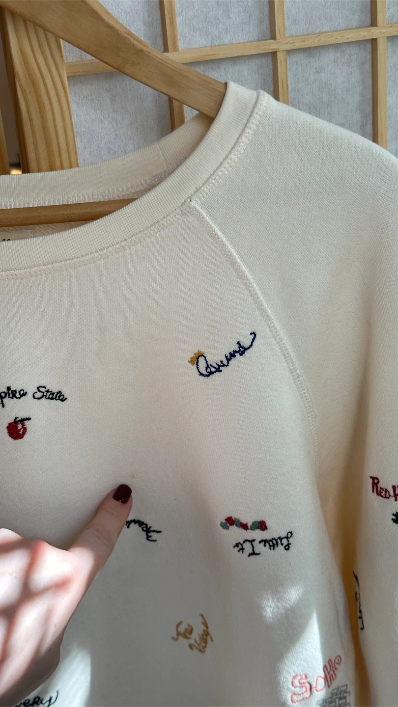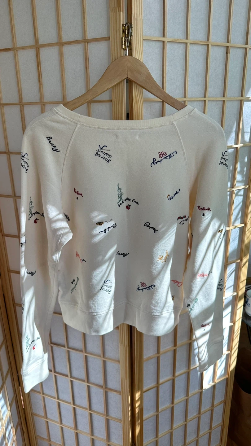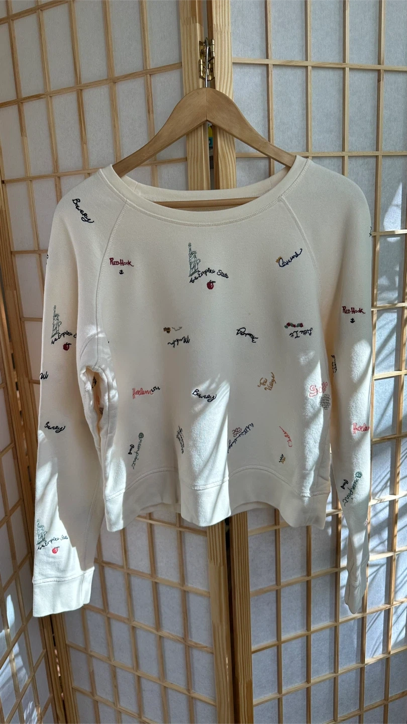 Selling a Madewell sweatshirt in size M but it is close to S, very fitted! It has embroidered graphics all over, gives a light vintage feel.