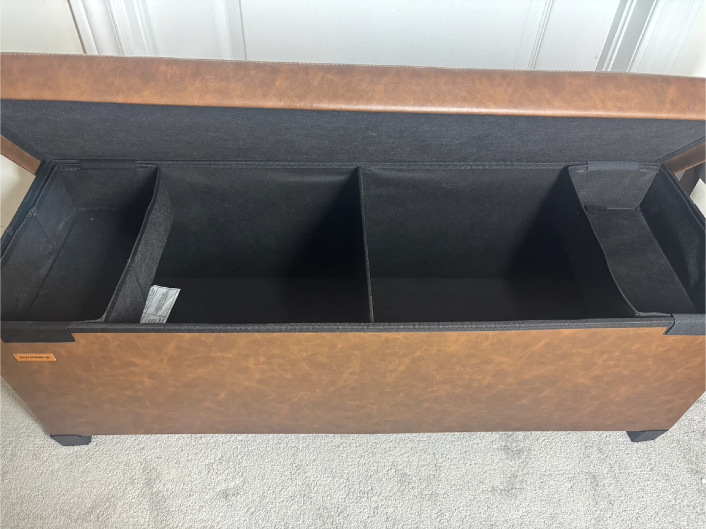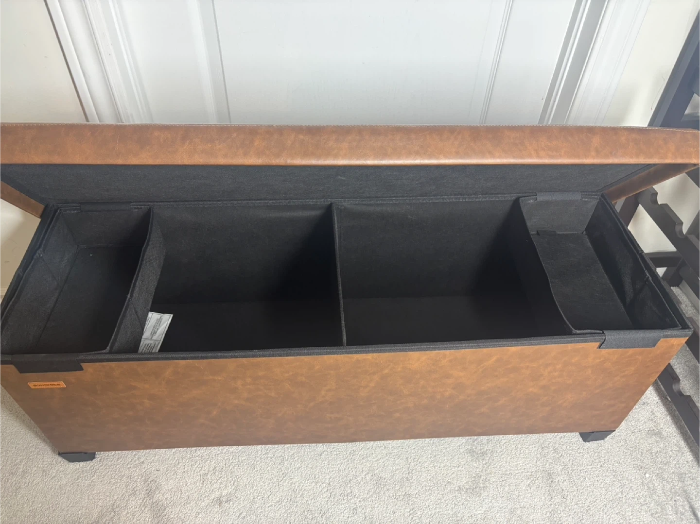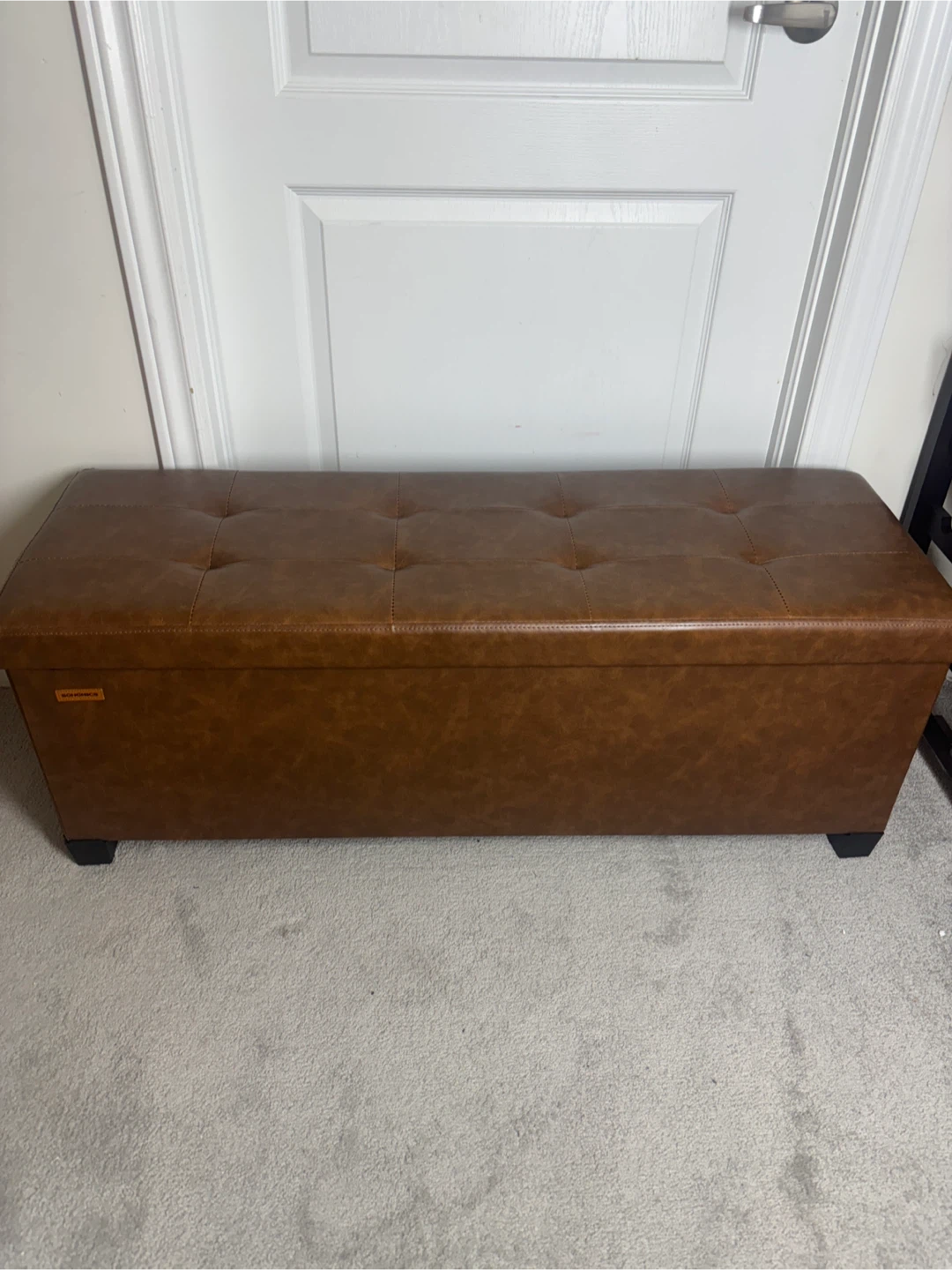 brown faux leather storage ottoman bench! It measures approximately 15" x 43" x 15". It has a max static weight capacity of 660 lb. It's perfect for storing blankets, toys, or anything else you need to keep out of sight
