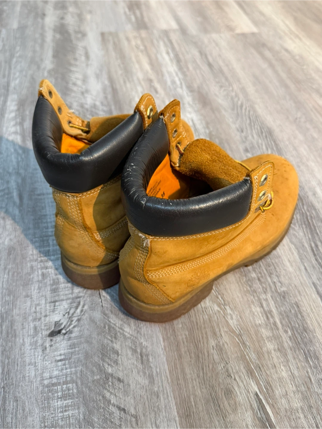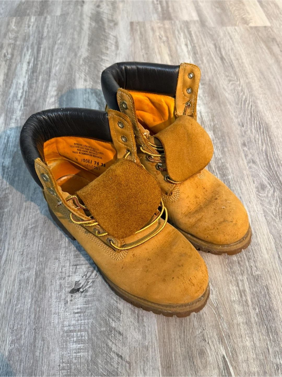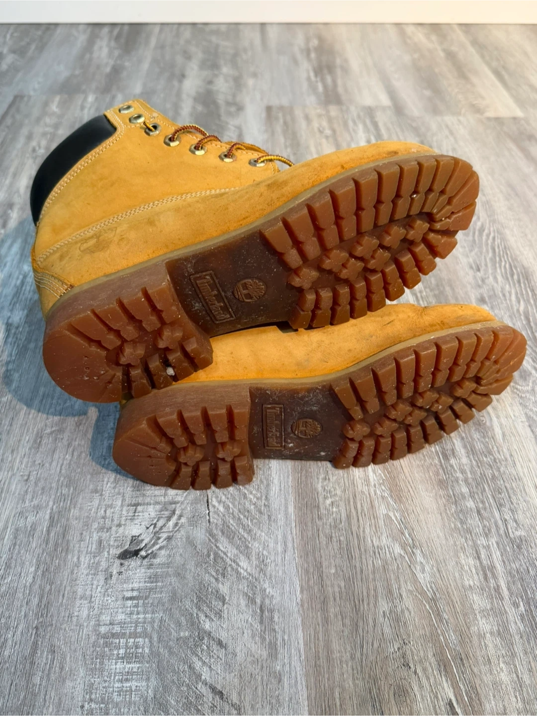 Selling a pair of Timberland 6-Inch Premium Waterproof Boots in a classic tan colour. They show some signs of wear, but are still in good condition and ready for more adventures! These are durable and iconic boots that will keep your feet comfortable and dry.