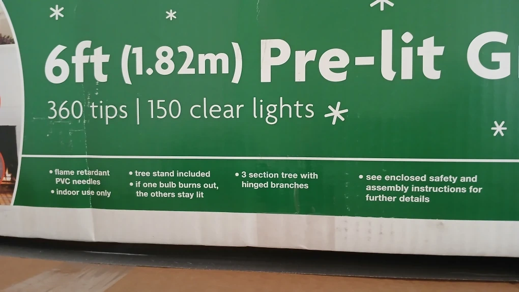 It has 360 tips and 150 clear lights. The tree is flame retardant, has PVC needles, and is for indoor use only. It also includes a tree stand. The tree is a 3 section tree with hinged branches and comes with safety and assembly instructions. Originally bought for $35!