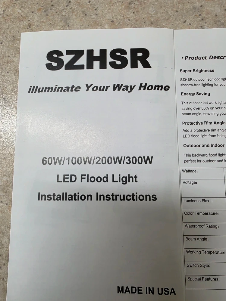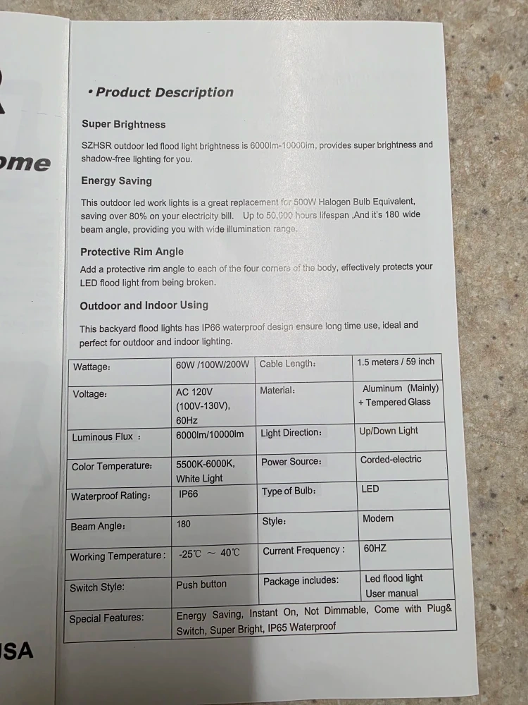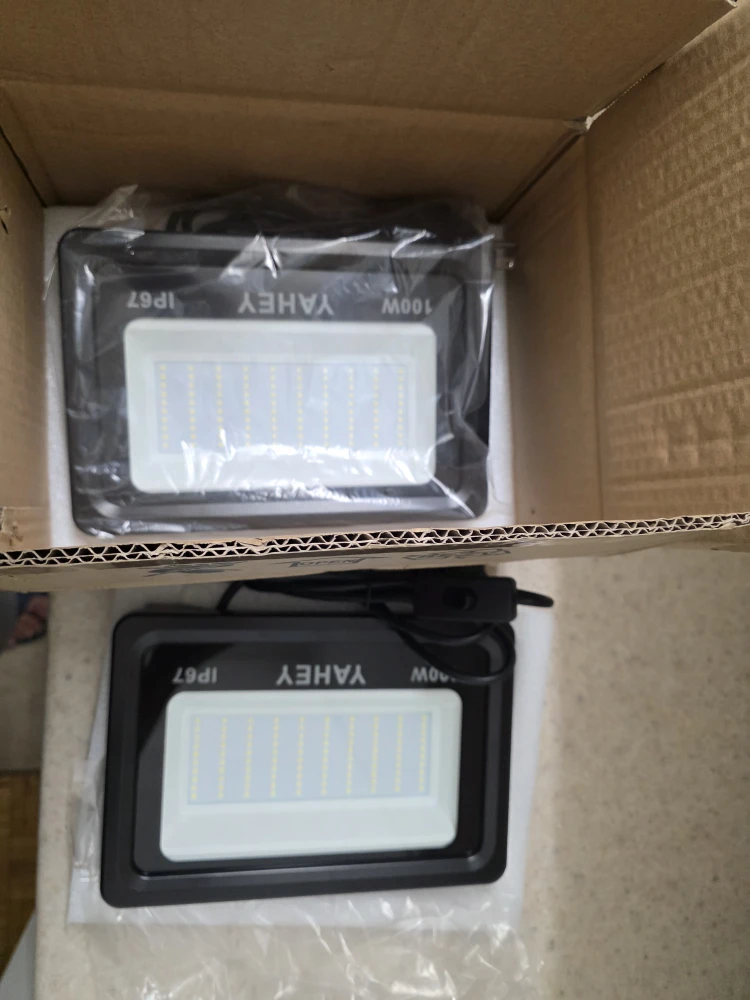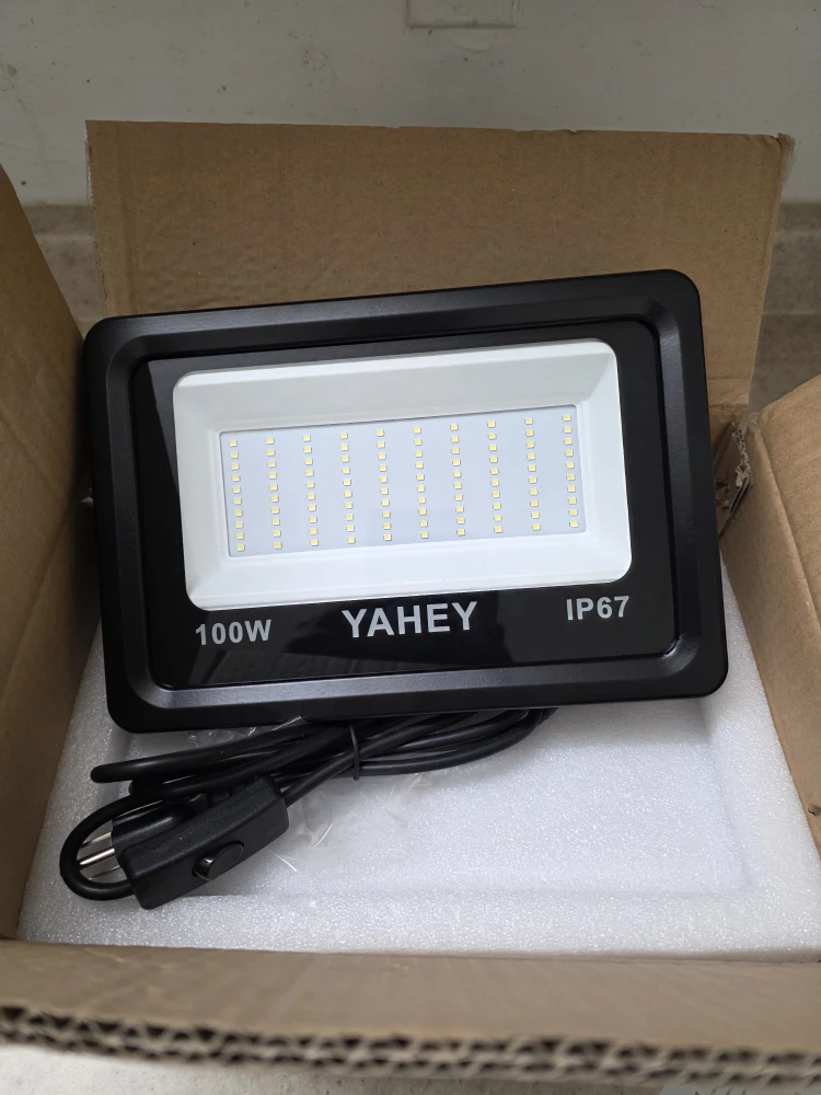 I have two brand new SZHSR/YAHEY 100W LED Flood Lights still in their original box. These lights are perfect for outdoor or indoor use, with an IP66 waterproof design. They provide super brightness and energy saving, replacing 500W Halogen Bulb Equivalent. The package includes the LED flood light and user manual
