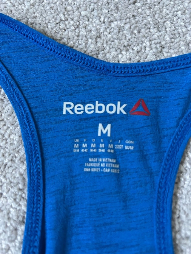 This is a Reebok tank top, perfect for workouts or casual wear, made with breathable fabric. Being in good condition, it's ready for a new home. Specifications: * Brand: Reebok * Size: Medium * Colour: Blue * Style: Racerback This top has plenty of life left and is just waiting to be worn for your next fitness adventure. Remember, if the ad is up, it's still available!